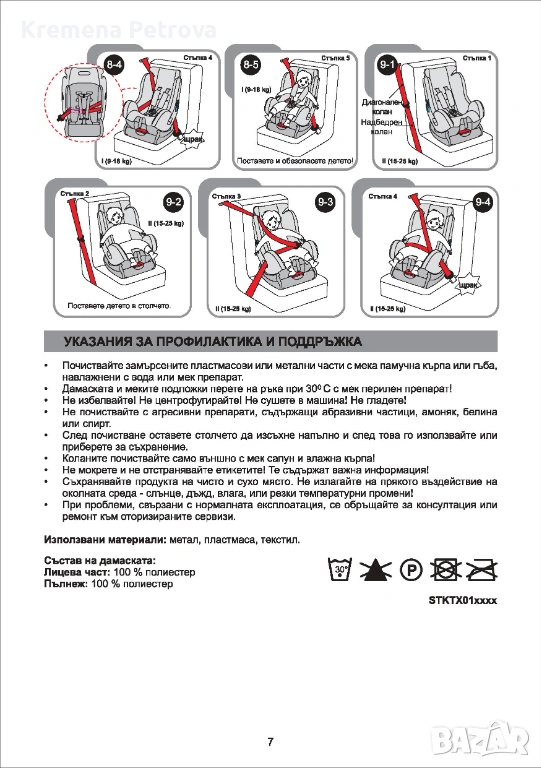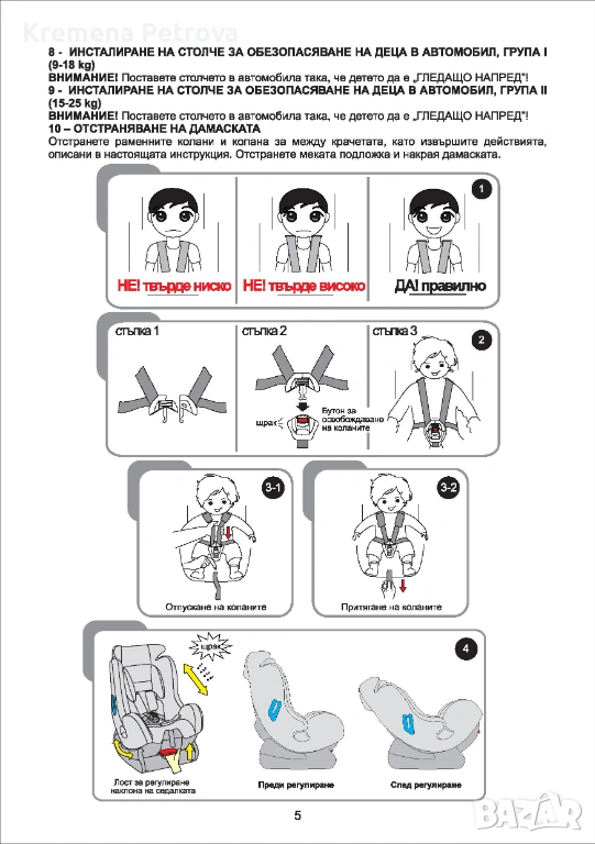 - За деца от 9 до 18 кг столчето се монтира по посока на движението на автомобилна седалка без въздушна възглавница с помощта на 3 точковите колани на автомобила, а за обезопасяването на детето се използват коланите на столче;