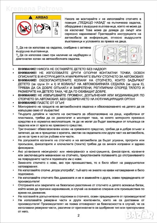 - За деца от раждането до около 9 кг тегло столчето се монтира обратно на посоката на движение на седалка без въздушна възглавница с помощта на 3 точковите колани на автомобила, а детето е обезопасено с предпазните 5 точкови колани на столчето;