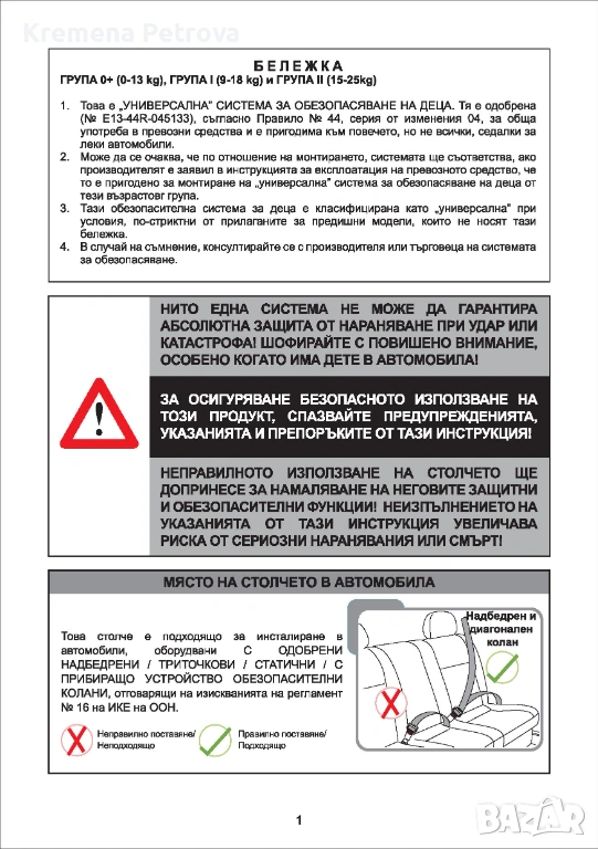 - Сертифицирано по ECE R44/04.