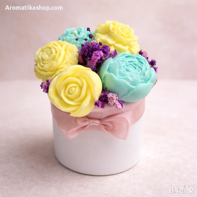Букетът съчетава детайлни сапунени цветя в нежни пролетни нюанси – слънчево жълто, ментово зелено и лавандулено лилаво.