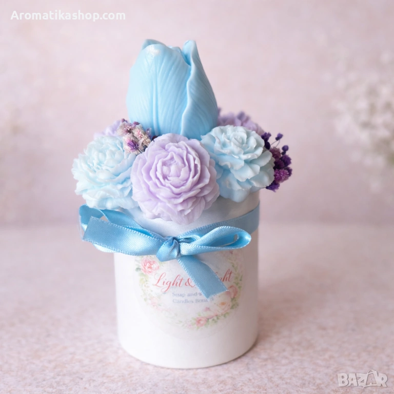 Композицията съчетава ръчно изработено лале в небесносин нюанс, обградено от деликатни сапунени цветчета в светлосиньо и лавандула, а нежната сатенена панделка придава завършен, изискан вид.