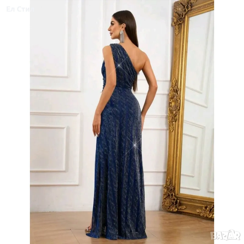 стилна бална рокля с едно рамо от тъмносиня материя с вгръдена сребриста нишка