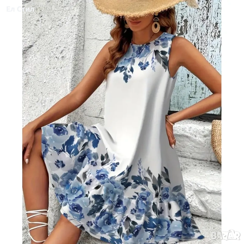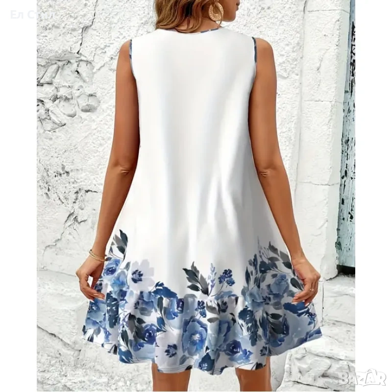 💕Бяла рокля със сини цветя модел трапец