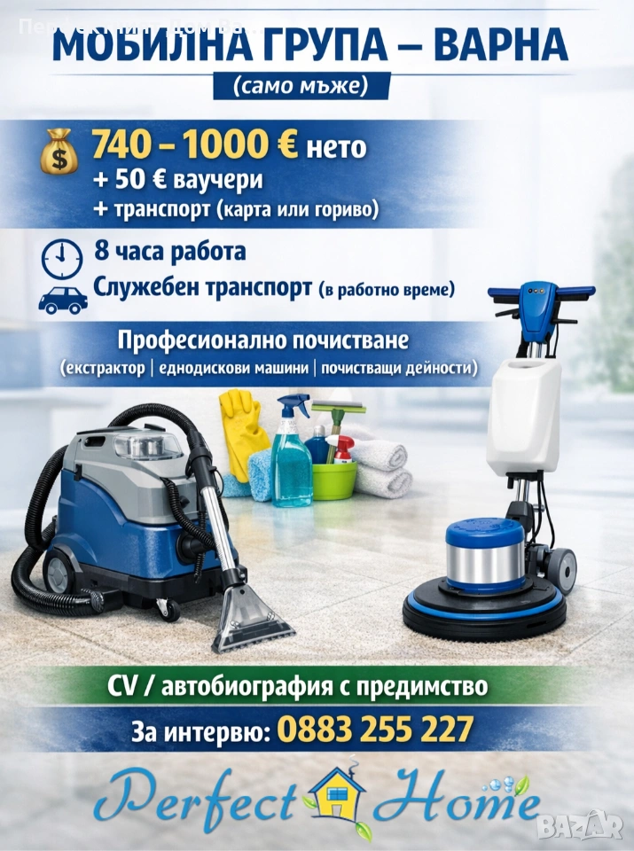 "Перфектният Дом Варна" ЕООД , компания с дългогодишен опит в професионалното почистване, търси да сформира нов екип за мобилна група гр. Варна. Екипа се състои само от мъже. Предлагаме * Обучение на място * Работа в екип * Ваучери и транспорт (платена карта/гориво) * Ясна схема за увеличение , според научените дейности и самостоятелна работа * ТД , сключен с Перфектният дом Варна ЕООД * Служебен транспорт в работно време Работно време : нормирано 8ч Основни задължения : Работа в екип по обекти - професионално почистване и работа с различни машини Заплащане в диапазон между 740 -1000 евро(нето) , ваучер за храна 50 евро + платена карта за транспорт или гориво на същата стойност. Човешки ресурси : 0883 255 227 Всички кандидатури ще се разглеждат под пълна конфиденциалност