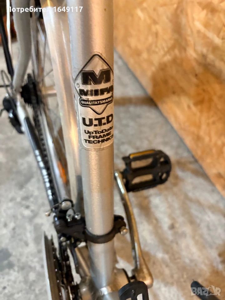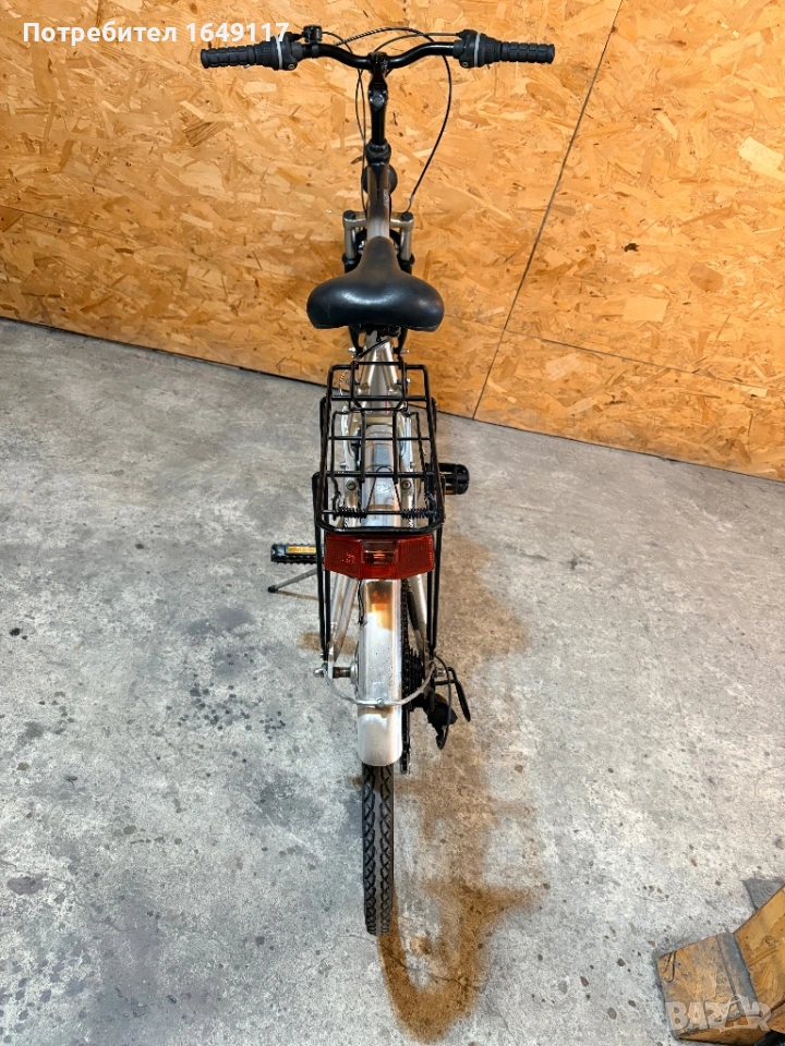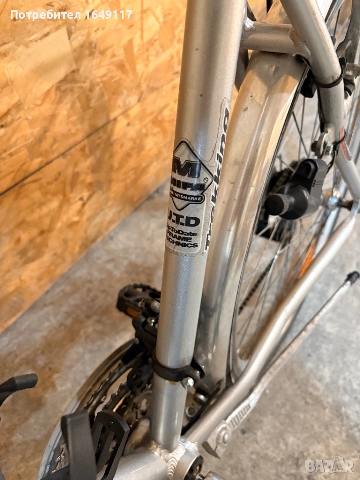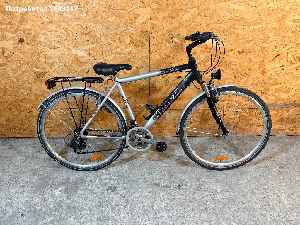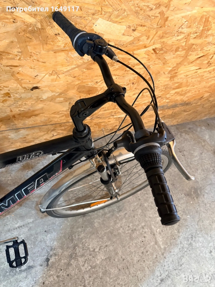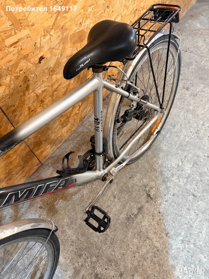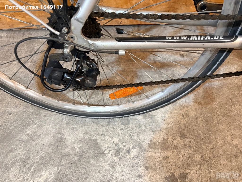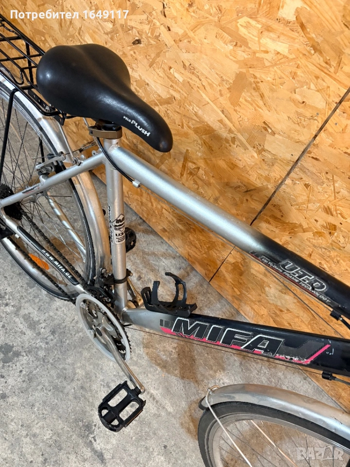 Продавам 28цола, употребяван, градски велосипед MIFA U.T.D[made in Germany]. Алуминиева, тънкостенна рамка - 50см. Външни скорости Shimano Tourney - 21бр. c revo shift команди. Предна амортисьорна вилка. Никелирани курбели. Eргономична - гелова седалка VeloPlush. Алуминиеви, двойностенни-аеро капли Schurmann, и гуми Schwalbe с усилен профил. Предна и задна алуминиеви V-break спирачки. Кормило с алуминиева-раздвижна лапа. Заден багажник с натоварване до 20кг. Олекотени калници, алуминиева стойка, светлоотразители, халогенен фар и габаритна светлина с динамо, звънец, кошничка за бутилка.