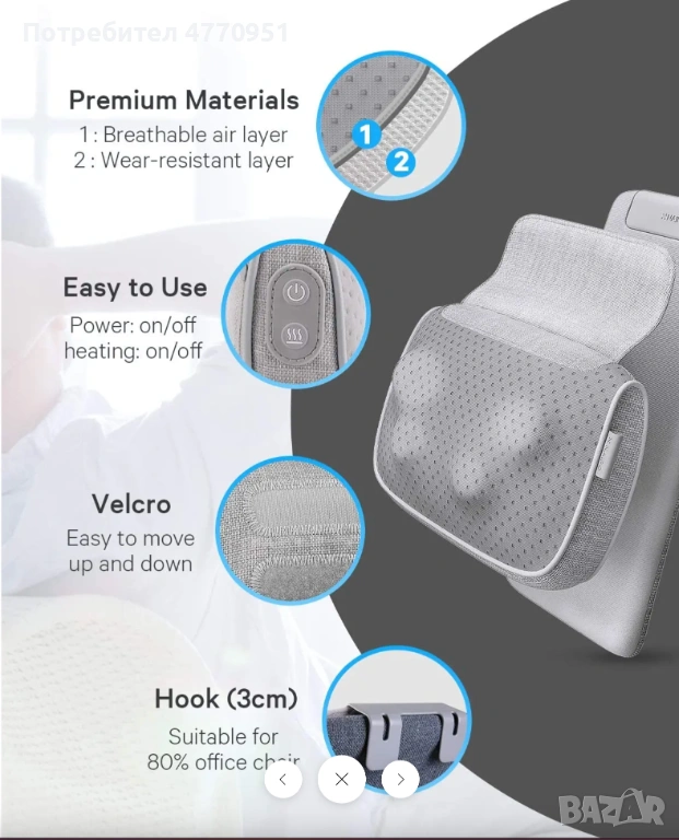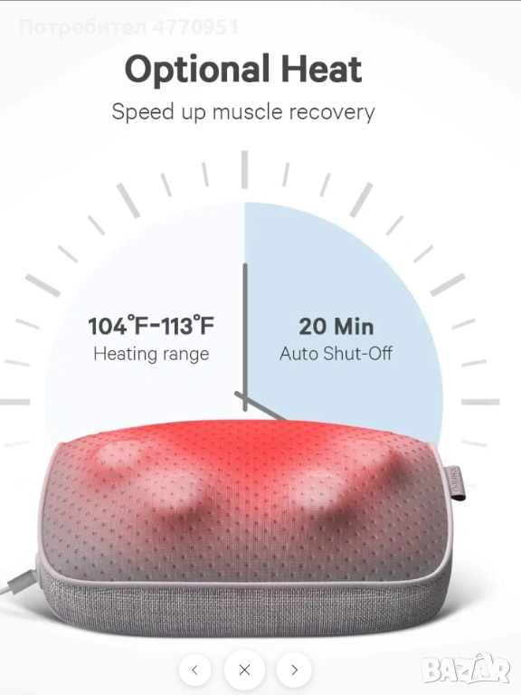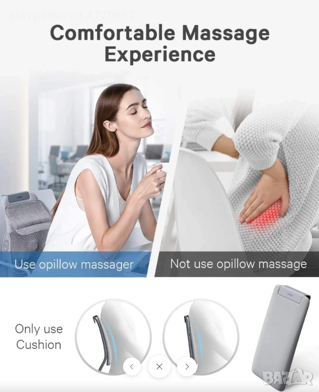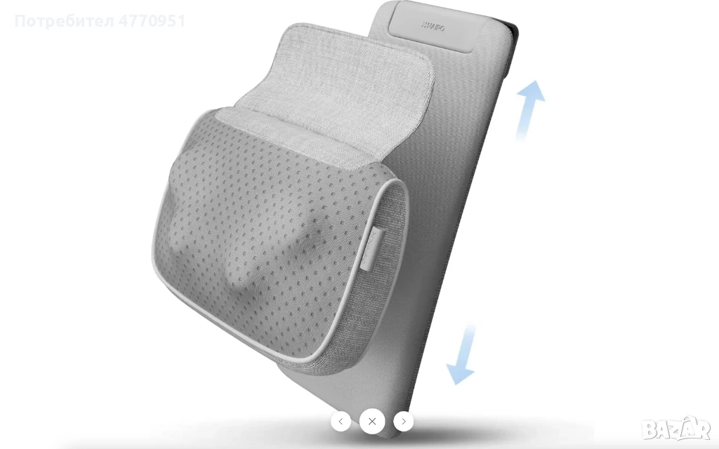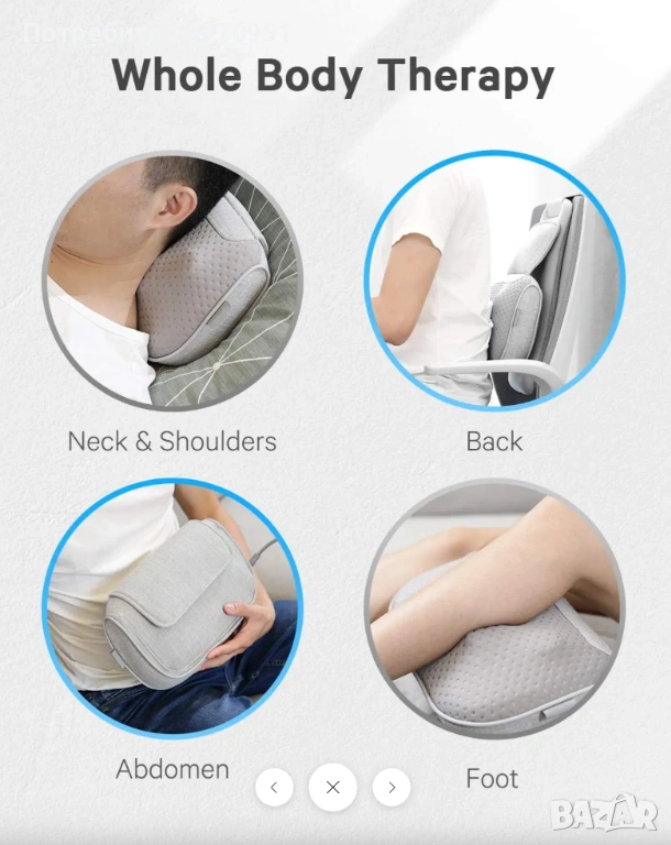 Състои се от масажор и възглавница с гъвкаво закрепване, което позволява лесно регулиране за поставяне на масажора в правилната позиция. Масажорът може да се използва и самостоятелно, без възглавницата. Независимо дали сте в офиса или у дома на дивана, можете да се насладите на отпускащо масажно усещане.