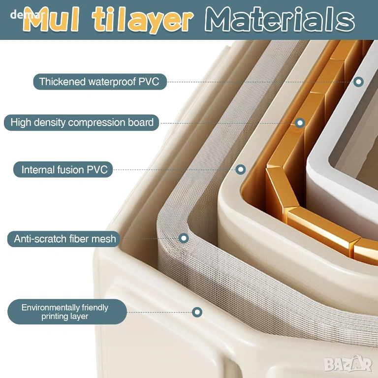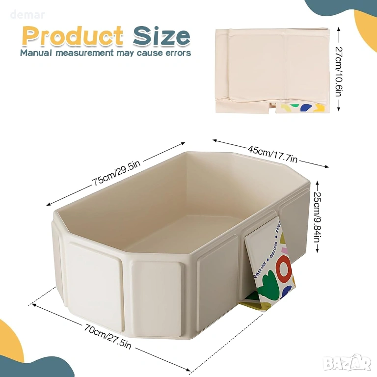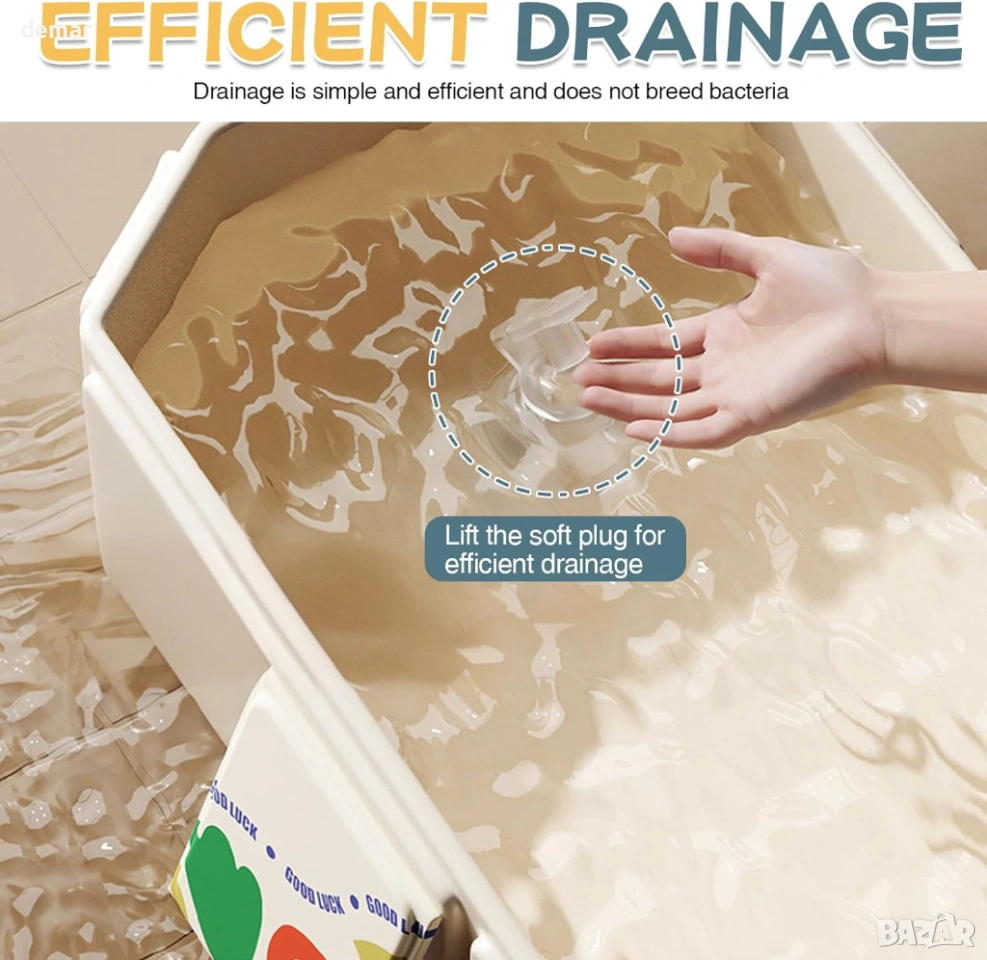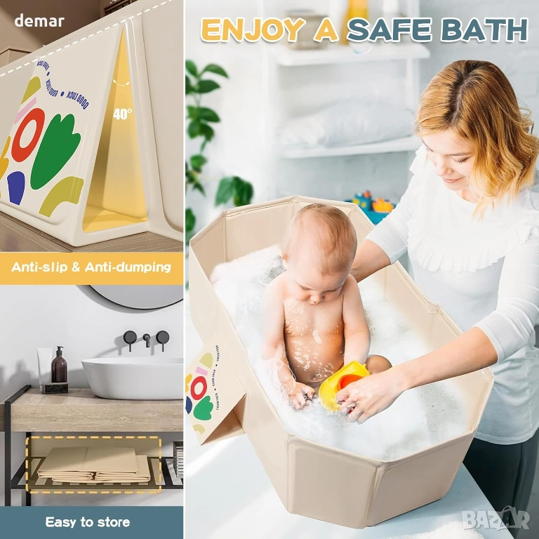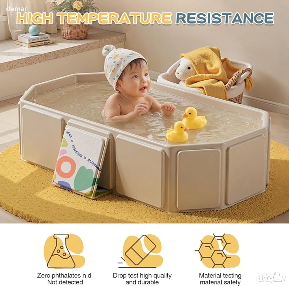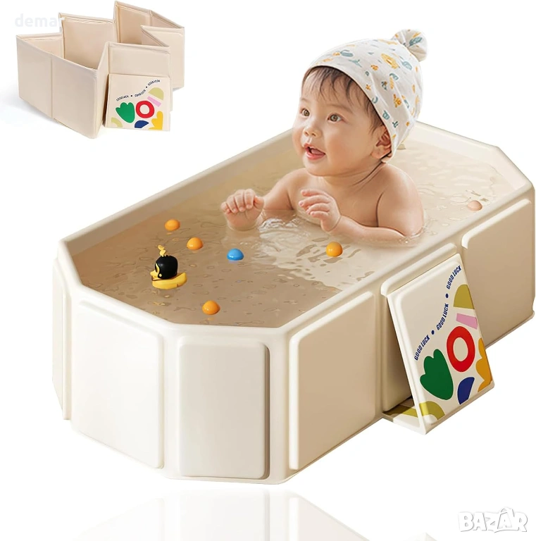 Тази сгъваема бебешка вана предлага просторен и удобен дизайн, подходящ за бебета и малки деца, с бързоизточваща тапа за лесно отстраняване на водата след употреба. Изработена от мек, щадящ кожата PVC с подсилени панели, тя гарантира издръжливост и дълготрайна надеждност дори при често сгъване. Компактната ѝ, сгъваема структура позволява лесно сглобяване за секунди и удобно съхранение, спестяващо място. Широката основа с подсилени опори и неплъзгащ се дизайн повишава стабилността и безопасността по време на къпане. Универсална за употреба, тя е идеална не само за къпане на деца, но и за накисване на дрехи, миене на домашни любимци, съхранение или дейности на открито, като например пътувания до плажа.