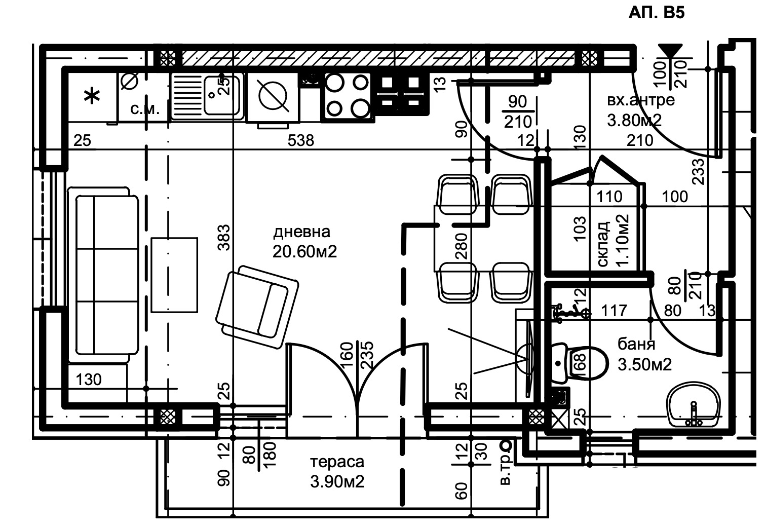 ➡Апартаментът се състои от антре, склад, баня с тоалетна, дневна с трапезария, тераса и е с обща площ от 48,76 кв.м.