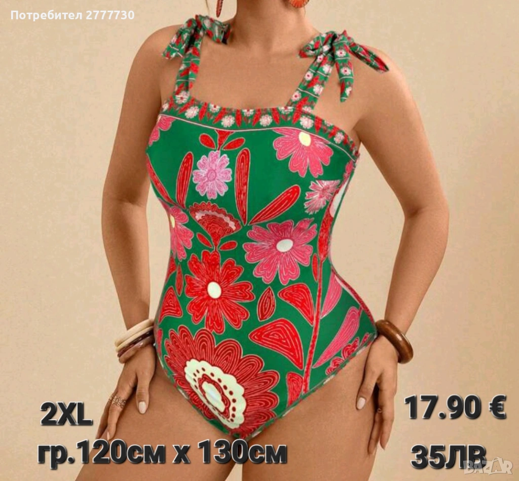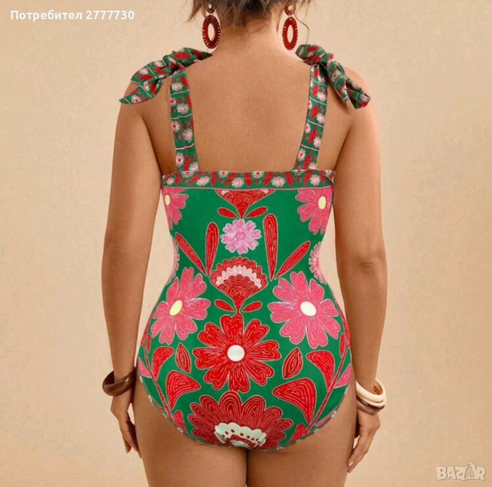 Цял бански флорален принт стил бохо. Връзва се на раменете това е хубавото че може да се регулират. Има подплънки които могат да се извадят при необходимост. Подходящ е за плаж и целогодишни СПА почивки. Размери 2XL гръдна 120см ханш 130см. Супер добре оформя тялото .Материята е страхотна с еластан. Доставяме по Еконт и Спиди опция преглед.