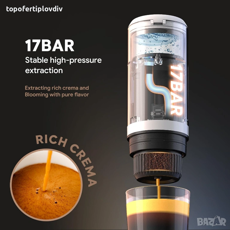Електрическа преносима еспресо машина: Напълно автоматична с акумулаторна батерия, дизайн с един бутон, няма нужда от ръчно натискане. Презареждащата се преносима кафе машина от е най-добрият избор да се насладите на до 40 мл истинско еспресо у дома, в офиса и в движение.
