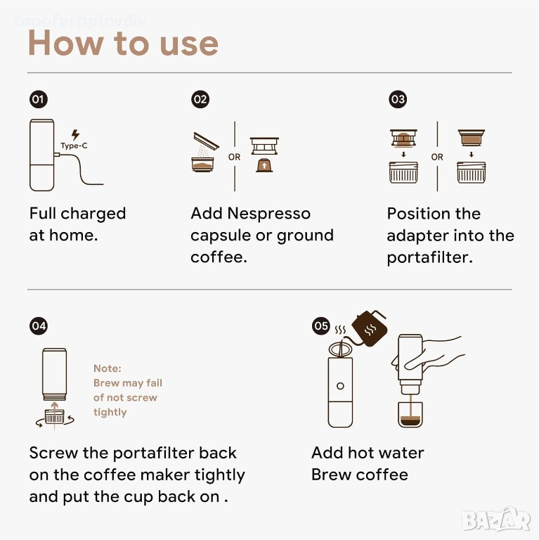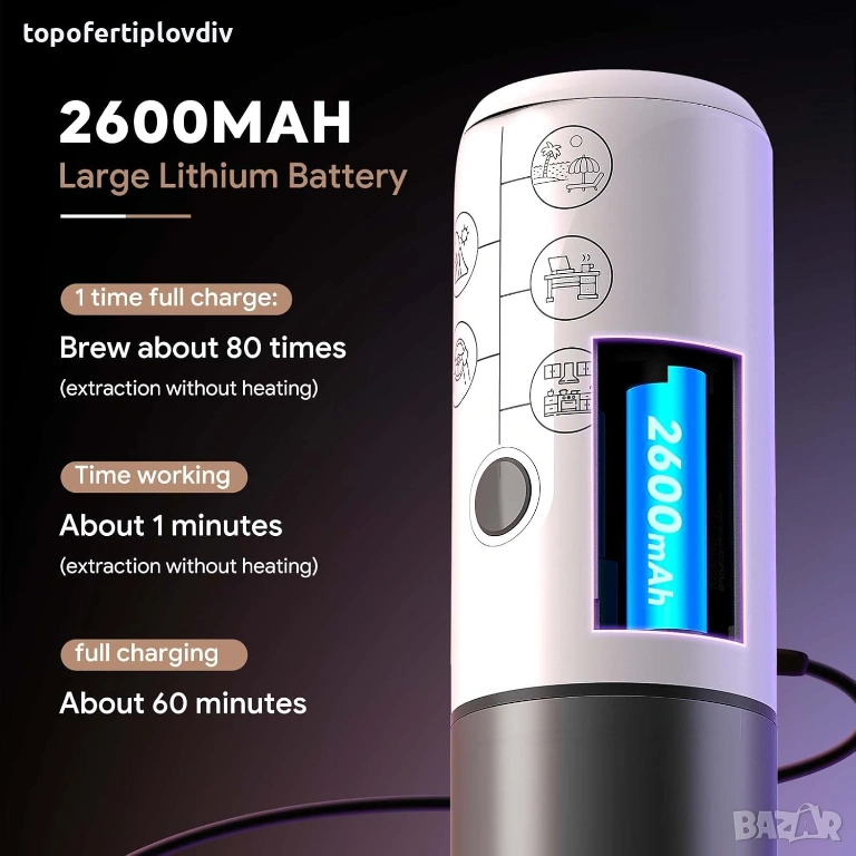 Супер живот на батерията: Машината за еспресо има вградена литиева батерия с голям капацитет, която може да се използва около 80 пъти за 60 минути зареждане, което е по-енергоспестяващо, енергоспестяващо и екологично.
