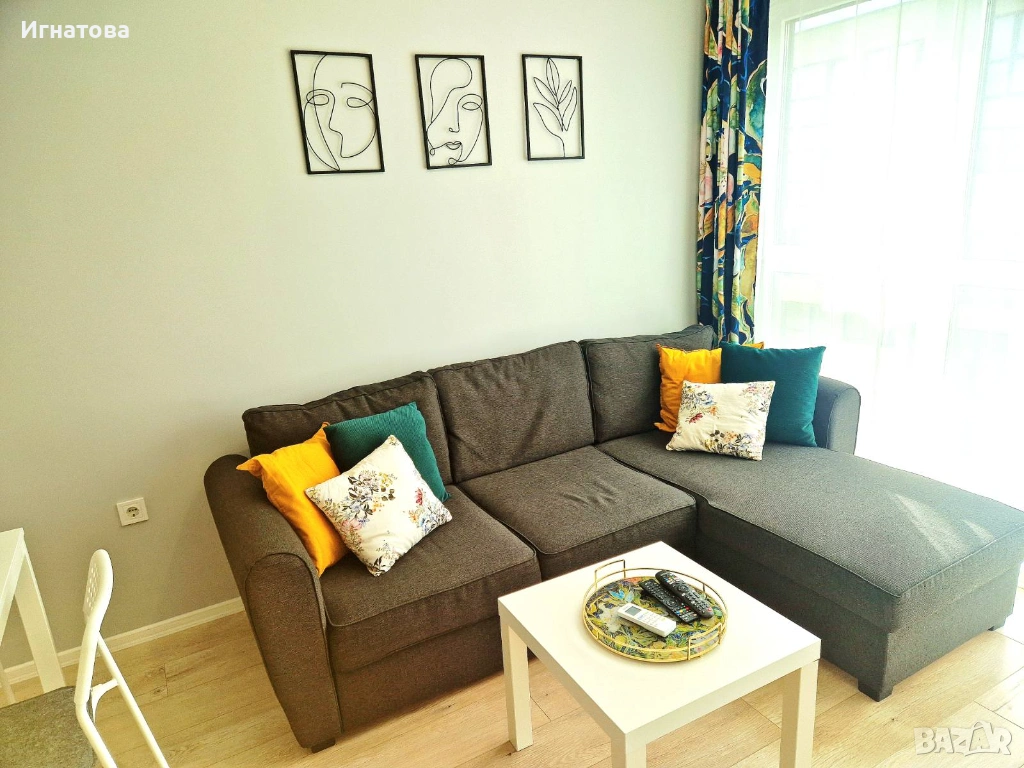 Апартаментът е с изложение запад, напълно обзаведен с мебели в модерен стил! Състои се от дневен тракт с разтегателен диван за 2 души, разтегателно легло за 1 човек, трапезария, оборудвана кухня, хладилник, фурна, индукционни котлони, мощен аспиратор. Пералня! Разполага с работен кът за учене / работа. В апартамента има 1 спалня с двойно легло за 2 души, разтегателен диван за 2 души и разтегателно легло за 1 човек. Апартаментът предлага 1 бр баня/тоалет, втора тоалетна с пералня, бойлер и мивка, килер, коридор. Слънчева западна тераса с градинска мебел!