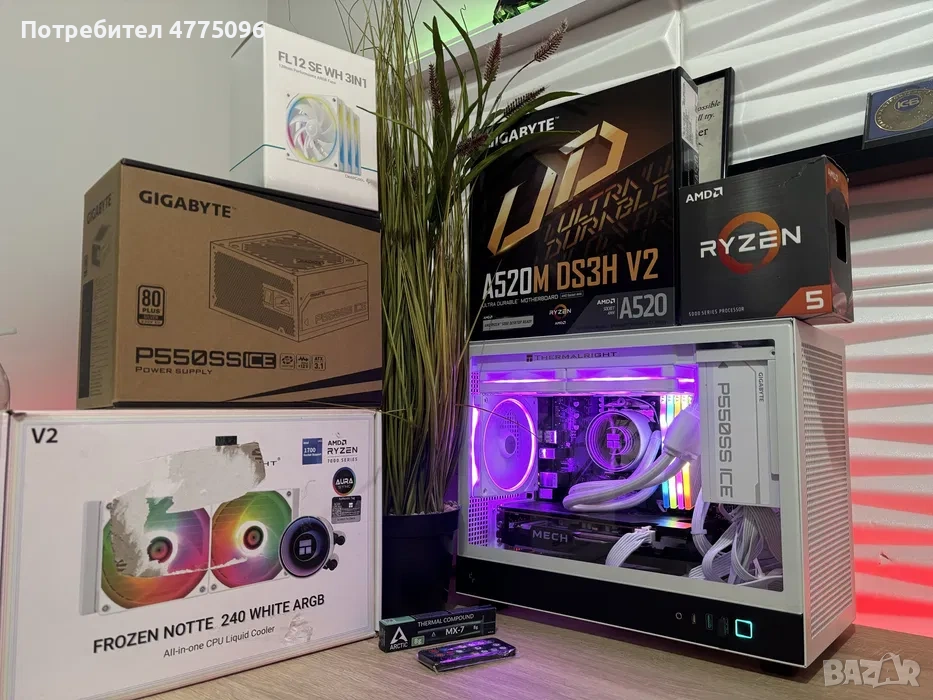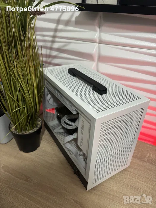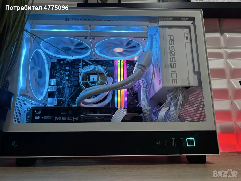 Продава се ново сглобен готов за ползване бял компактен геймърски компютър.