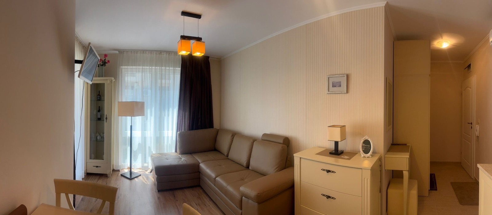 Просторна стая с диван, телевизор, климатик, маса за хранене с 3 стола, скрин, витрина и тоалетка с огледало.