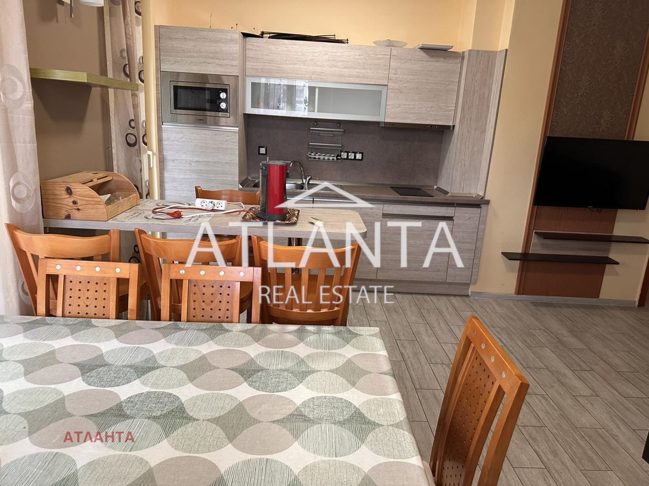Апартаментът е напълно обзаведен и оборудван, с всичко необходимо за едно домакинство, готов за нанасяне. Отоплението е на ток, посредством климатици.