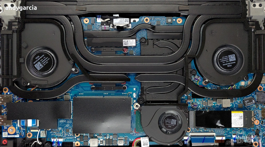 Освен изборените, лаптопа разполага с много ефективно охлаждане с цели 3 вентиалтора и множество топлинни тръби обединени от една цяла в задната част с прикрепен към нея радиатор за споделяне и регулиране на топлината.