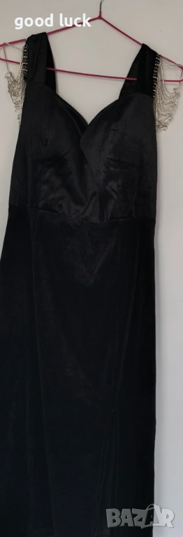 Нова черна официална рокля с подплънки на гърдите и с малка цепка отстрани на крака,и с интересни бели декорации по раменете.Като материя е много ефектна,или плюш или кадифе,На живо изглежда много по хубаво.