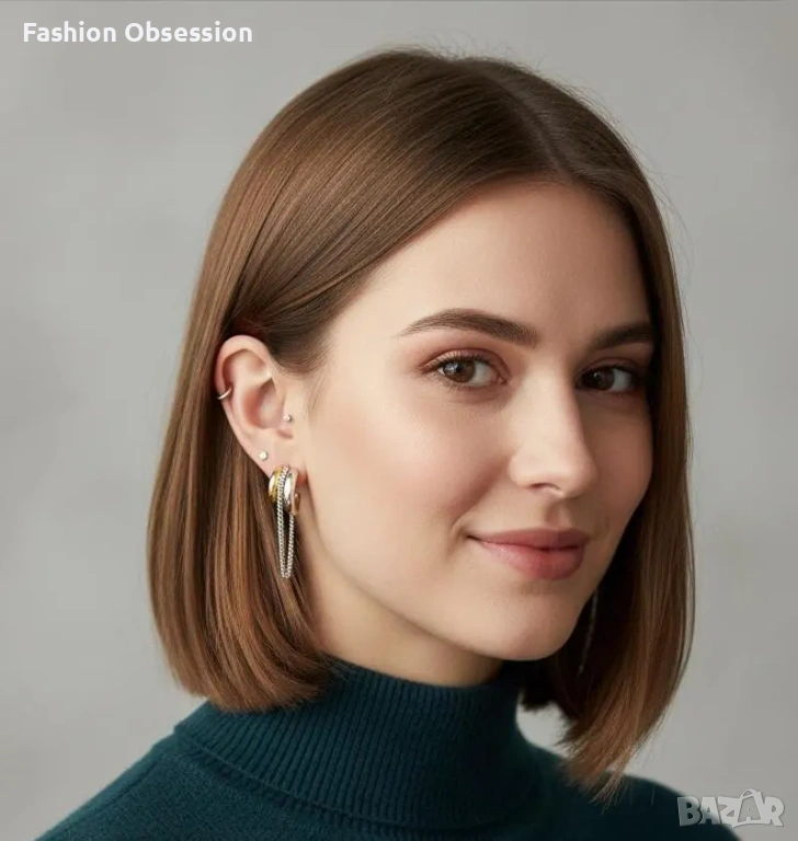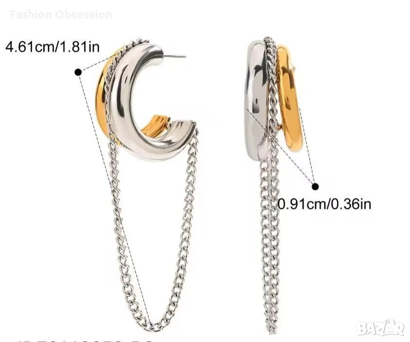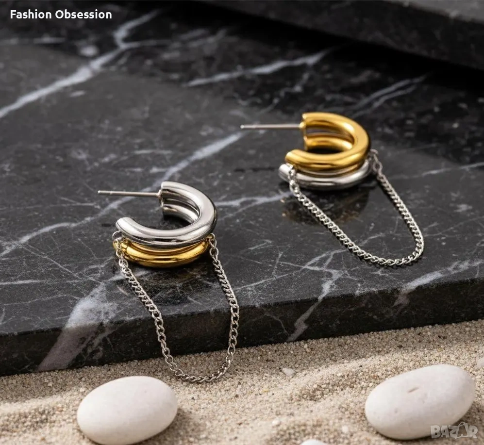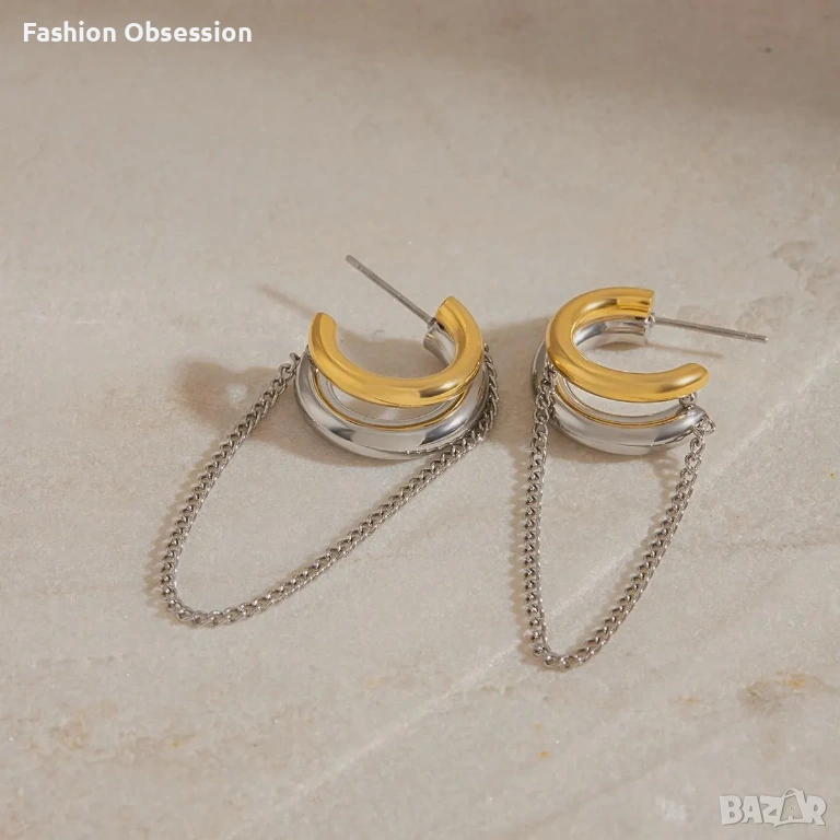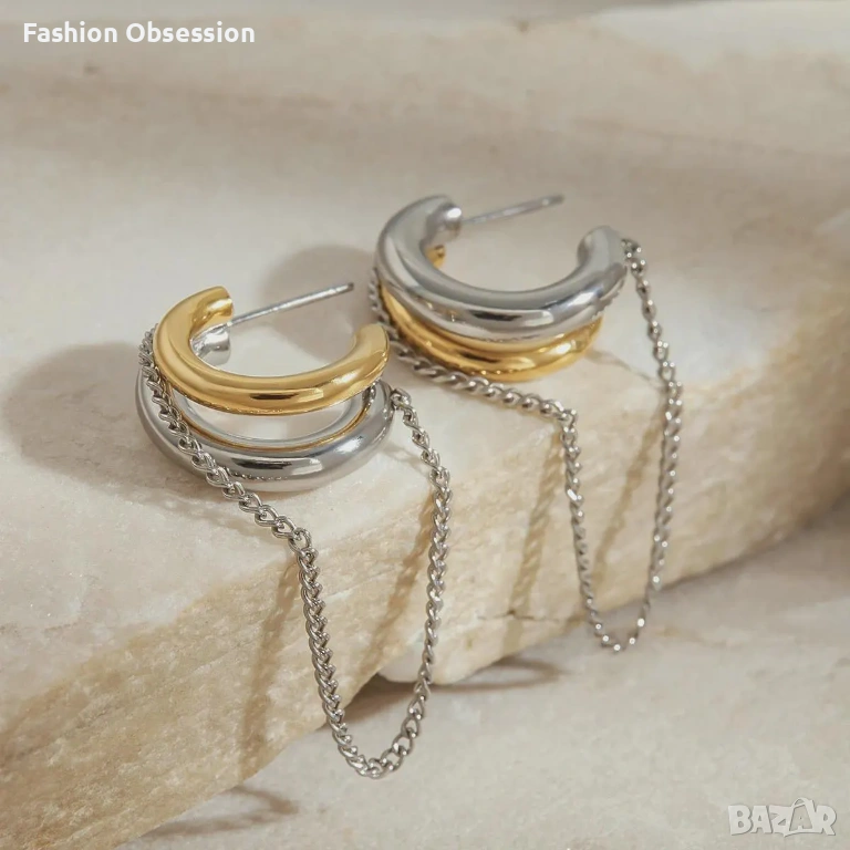 Стилни дамски обеци тип халки в актуален двуцветен дизайн – комбинация от злато и сребро. Моделът е изключително модерен и лесен за комбиниране както с ежедневни, така и с елегантни визии.