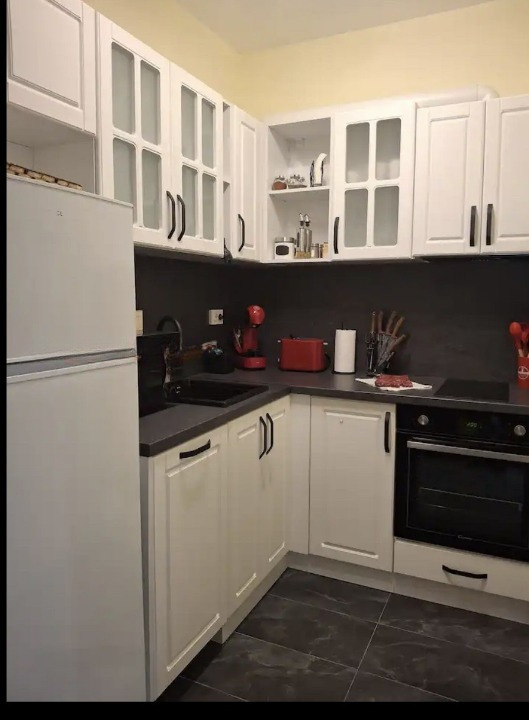 Напълно реновиран и обзаведен тристаен апартамент на ул. Будапеща, в близост до ул. Поп Богомил. Разпределение: кухненски бокс с хол, две спални, мокро помещение, две бани с тоалетни и тераса. Изложение изток-юг. Гледа към вътрешен двор, който може да се използва.