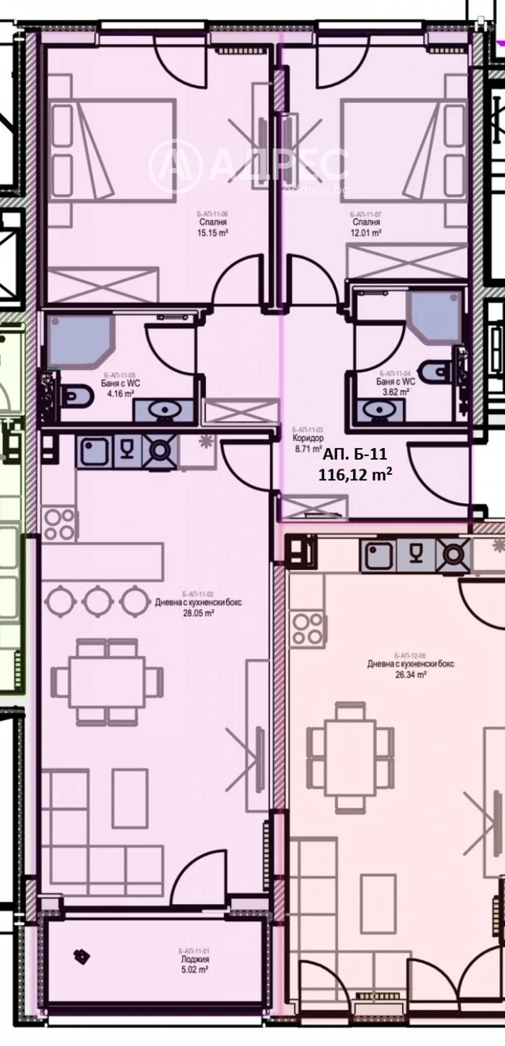 Тристаен апартамент в Младост, състоящ се от антре, две спални, две бани с тоалетни, всекидневна с кухненски бокс и тераса. Възможност за гараж или паркомясто.