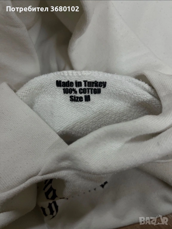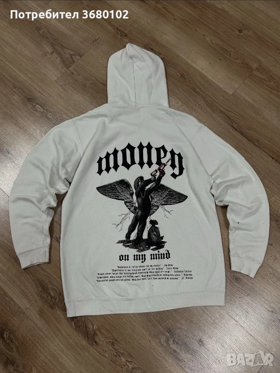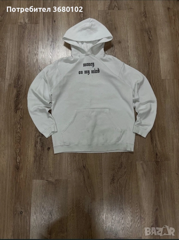 Бял суичър с надпис 'Money on my mind “. Много удобен, стилен суичър, става за ежедневна употреба. Носен е точно 2 пъти, продавам го, защото не ми харесва