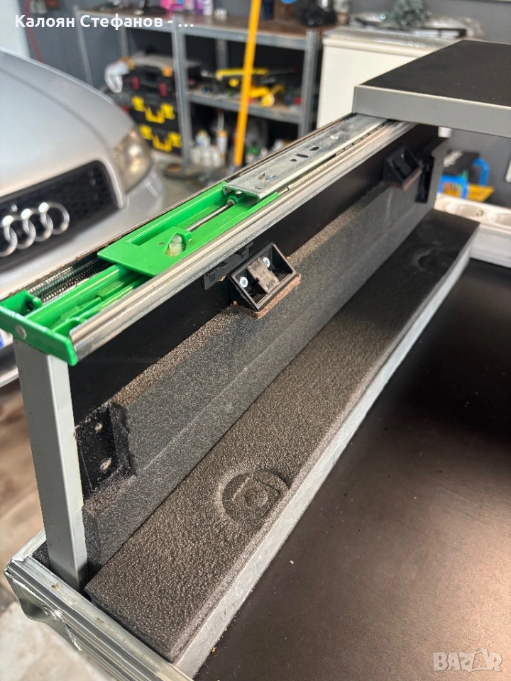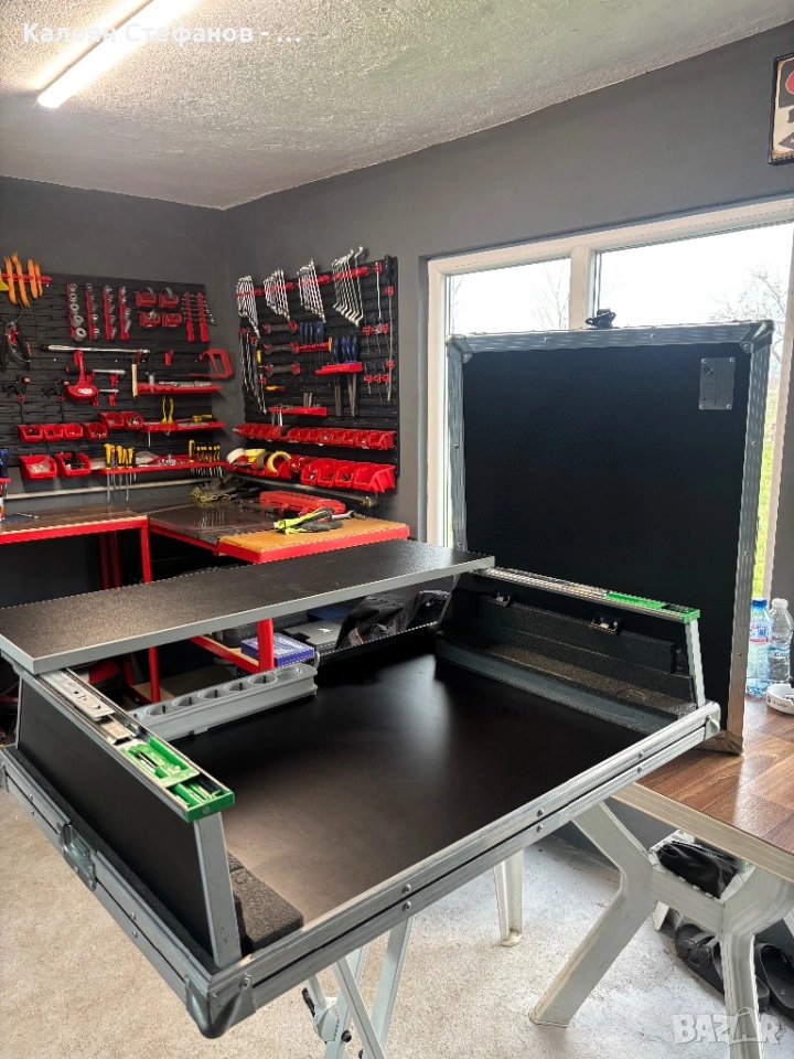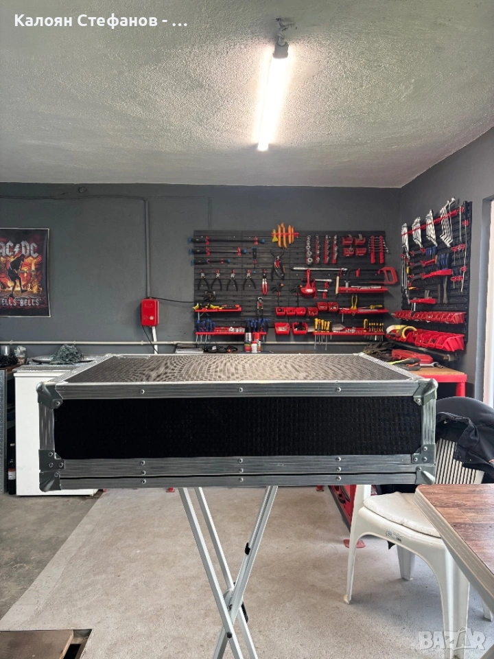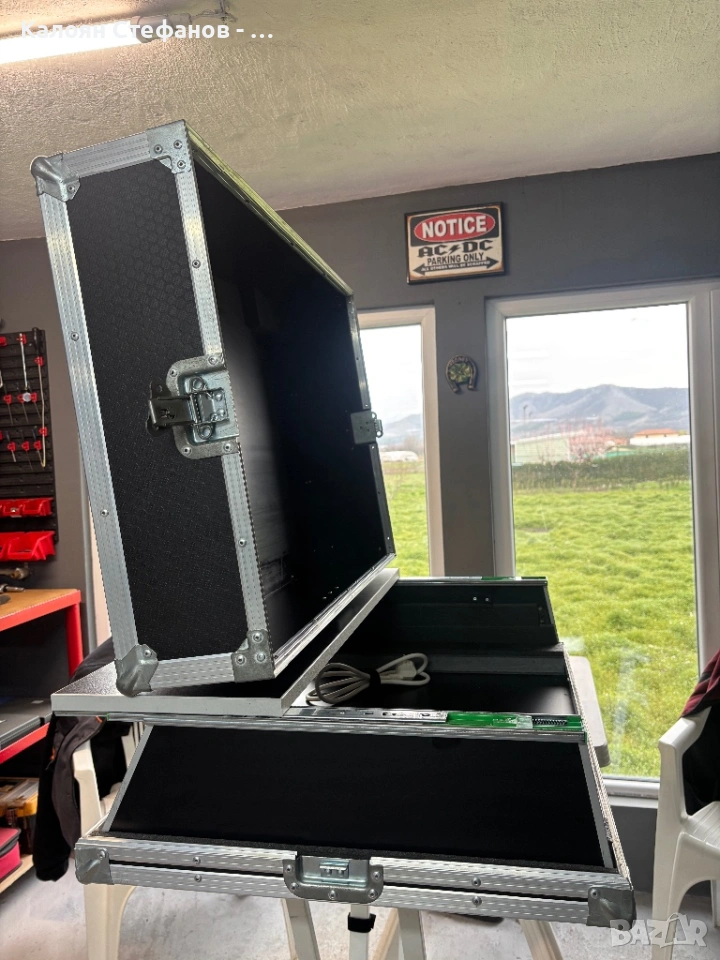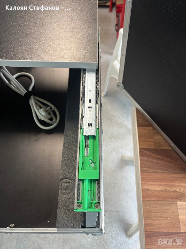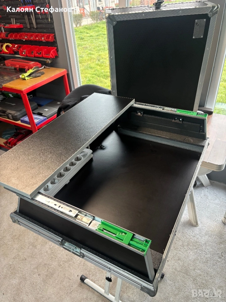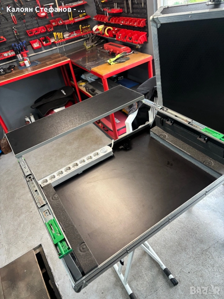 Кейсът е ползван много малко и е в много добро състояние с минимални следи от употреба. Разполага с вграден разклонител с бутон и 8 гнезда, както и плъзгаща се, подвижна масичка.