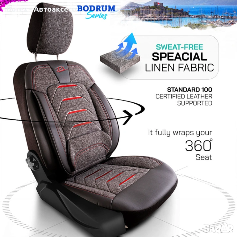 Пълен комплект универсална тапицерия за автомобил, изработена от оригинална ленена материя и висококачествена кожа. Специално проектираната форма в комбинация с гъвкавата материя осигурява отлично прилягане към почти всички модели автомобили.