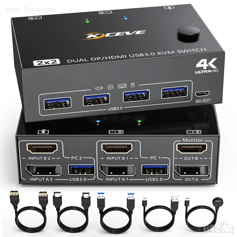 KCEVE DP HDMI USB 3.0 KVM превключвател за 2 компютъра и 2 монитора, два монитора