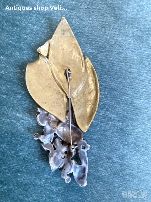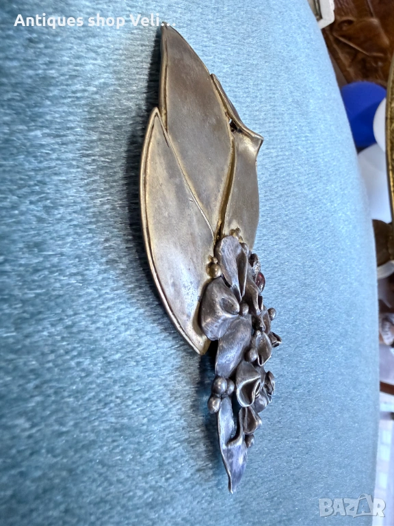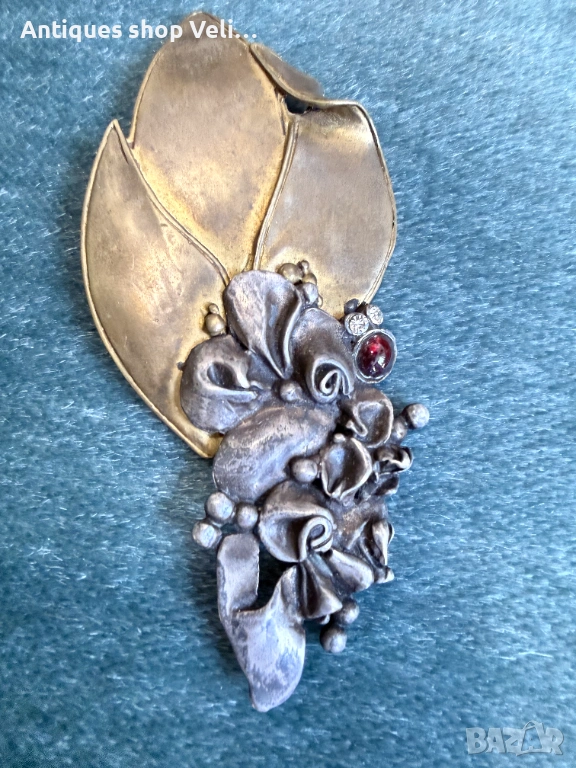 Красива брошка изработена от сребро 925 и бижутерски бронз окрасена с гранат и циркони. Флорален дизайн, целящ да създаде чуство за движение и живот. Отлично състояние. Предлагаме доставка с Еконт и лично предаване за градовете Велико Търново, Русе и Сливен. Размери-11/5см.
