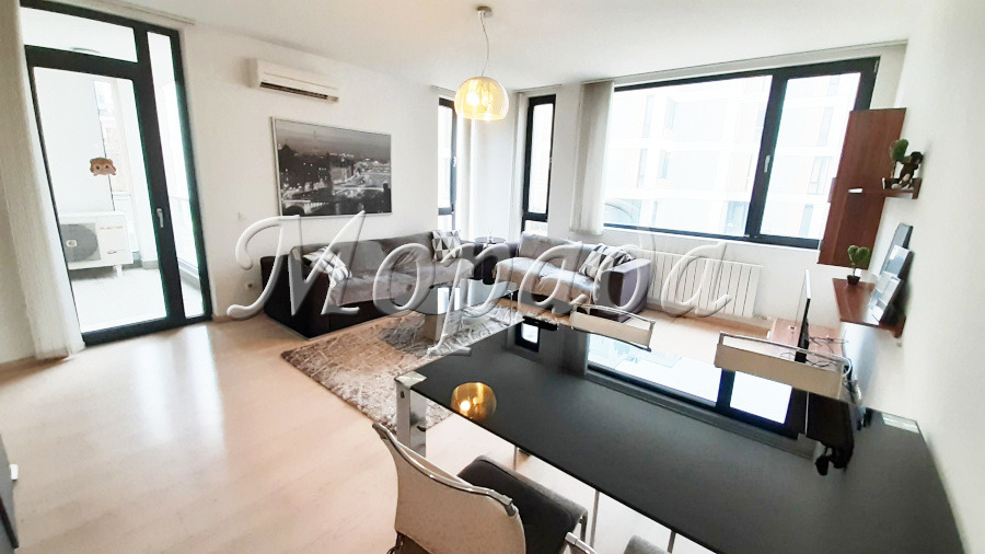 Отлично обзаведен и оборудван двустаен апартамент в затворен жилищен комплекс със закрит басейн, джакузи, сауна, фитнес, охрана, детски кът и зелени площи. Апартаментът е 62 кв.м. и се намира на ет. 2 в сграда с асансьор. Състои се от: входно антре, просторна дневна с кухненски бокс и трапезария , самостоятелна спалня, слънчева тераса пред спалнята с излаз от двете стаи и баня с тоалетна. Апартаментът е с изложение Югоизток изцяло, много слънчев, светъл, среден и с ниски разходи за отопление. Отоплението е с котле на газ както и с инверторни климатици, за допълнителен комфорт. Апартаментът е ремонтиран, напълно оборудван и обзаведен, включително пълна гама бяла техника за вграждане.