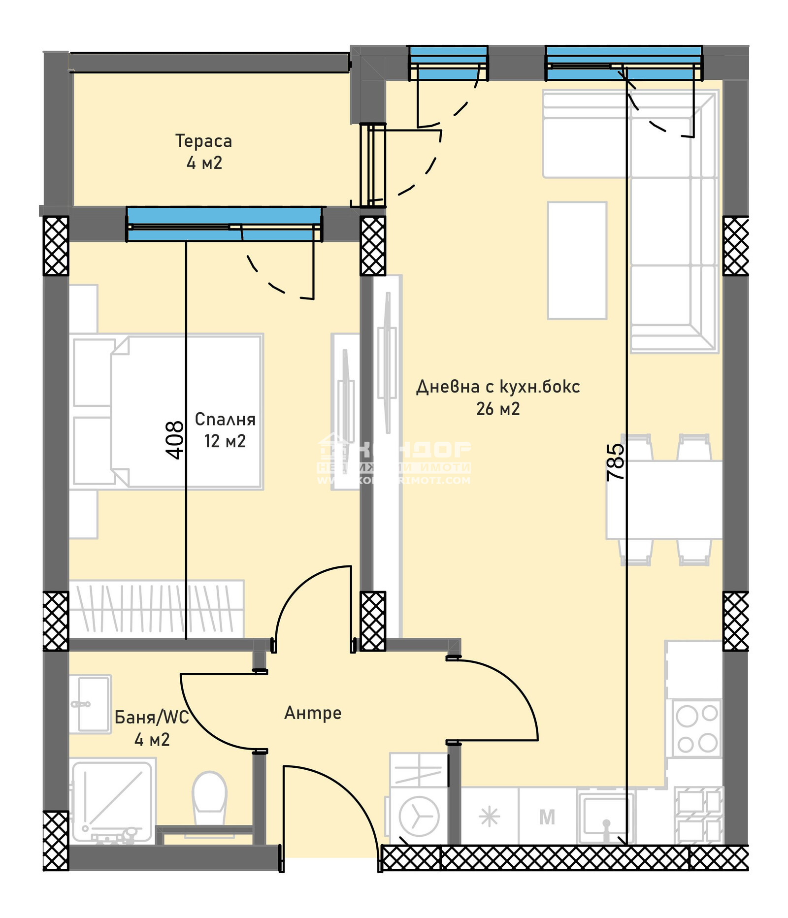 Оферта 64455 - Предлагаме Ви възможността да закупите 2 - стаен апартамент в новоизграждащ се луксозен жилищен комплекс с модерна визия, проектиран да създаде максимален комфорт на живущите в него. Функционално разположени жилищни секции с елегантен силует готов да предложи комфорт и модерен начин на живот. Едно от основните му предимства е страхотната локация, отлична комуникативност и динамична пътна инфраструктура, която осигурява бърз и лесен достъп до комплекса от всяка точка на града. Той съчетава лукс, спокойствие и комфорт с подсигурени паркоместа и гаражи. Жилището се състои от просторна дневна/26 кв.м./ с кухненска част и трапезария, една самостоятелна спалня 12кв.м., баня с тоалетна, входно антре с място за перално и една тераса обща за двете стаи. Към апартамента има избено помещение, включено в цената! Основната концепция при проектирането е да се постигнат просторни и функционални стаи, с цел да се създаде максимален уют на модерното семейство. Изключителна съвременна архитектура и модерна технология на строителство. Визията е иновативна, привличаща внимание с уникалността си. Всяко жилище ще разполага с пълно окабеляване за домофон, интернет и кабелна телевизия, общите части са луксозно завършени, жилищата са с алуминиева дограма с троен стъклопакет от най-висок клас, масивна блиндирана входна врата. За удобство на живущите съществува възможността да закупят подземни паркоместа и гаражи с топла връзка към комплекса. Гъвкави схеми на разсрочено плащане спрямо възможностите на клиента в рамките на строителството или закупуване чрез Банков Кредит, на изключително изгодни условия за клиенти на агенцията !!! Приложените изображения са от завършени проекти на строителната фирма.