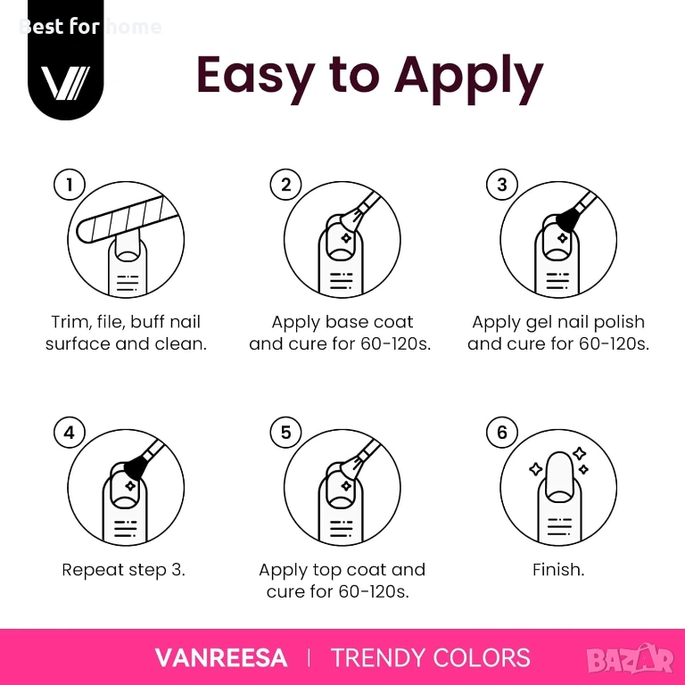 Как да използвате 1. Полирайте формата на нокътя с пила за нокти и отстранете кутикулата с тласкач за кутикули и вилица за кутикули. 2. Полирайте повърхността на нокътя с полираща машина за нокти, след което използвайте четка за нокти, за да отстраните праха от повърхността му. 3. Нанесете тънък слой базов лак върху повърхността на нокътя. 4. Сушете с лампа за нокти за 90-120 секунди, не избърсвайте. 5. Нанесете тънък слой гел лак и сушете с лампа за нокти. 6. Повторете стъпка 5. 7. Нанесете тънък слой топ лак/матов топ лак и сушете с лампа за нокти. 8. Завършете.