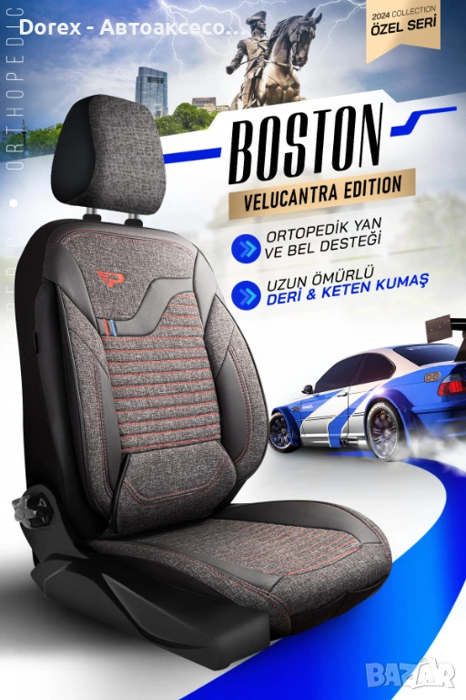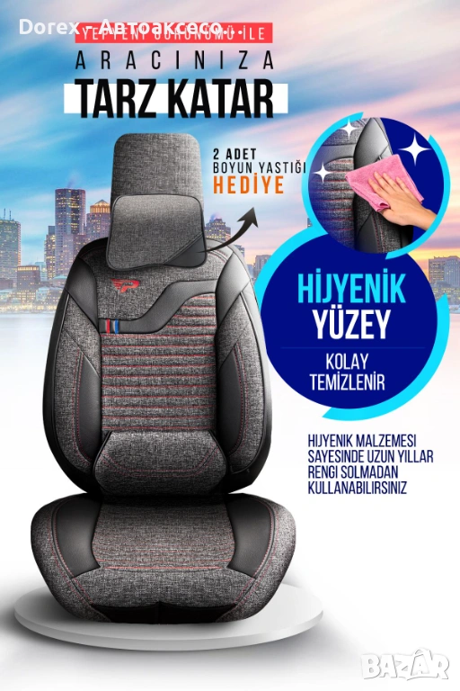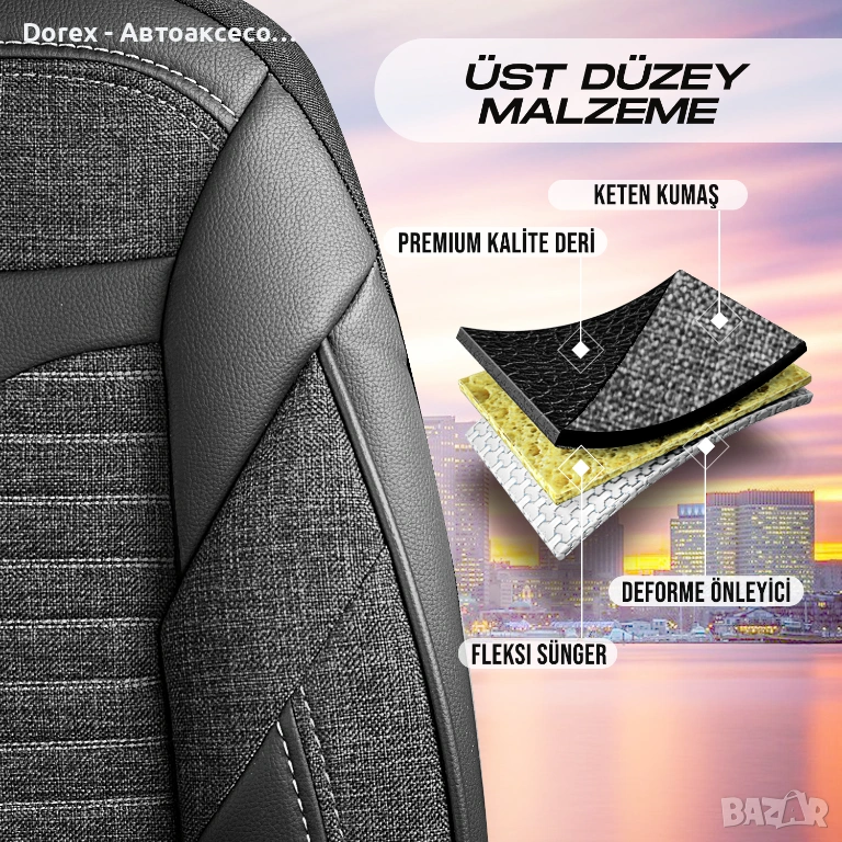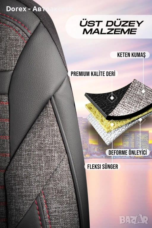 Пълен комплект универсална тапицерия за автомобил, изработена от оригинална ленена материя и висококачествена кожа. Специално проектираната форма в комбинация с гъвкавата материя осигурява отлично прилягане към почти всички модели автомобили.