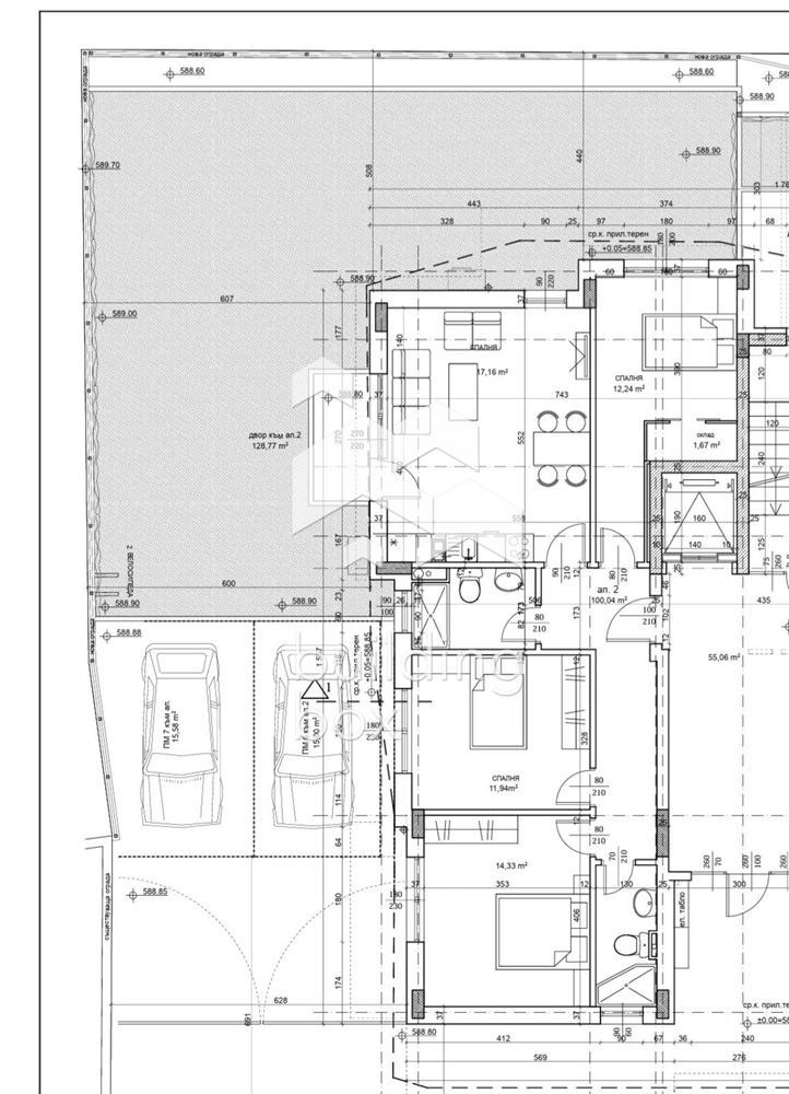 Апартаментът е със застроена площ от 100.04 кв.м., 116.50 кв.м. с общите части и 128 кв.м. вътрешен двор.