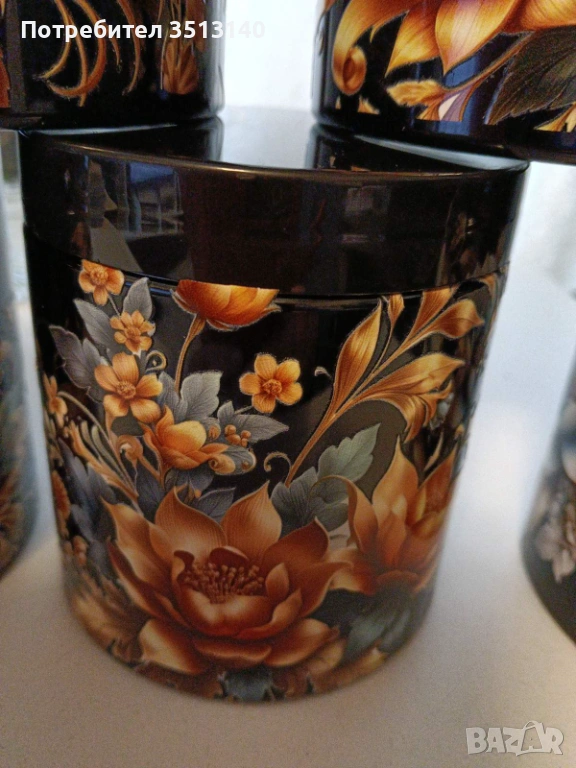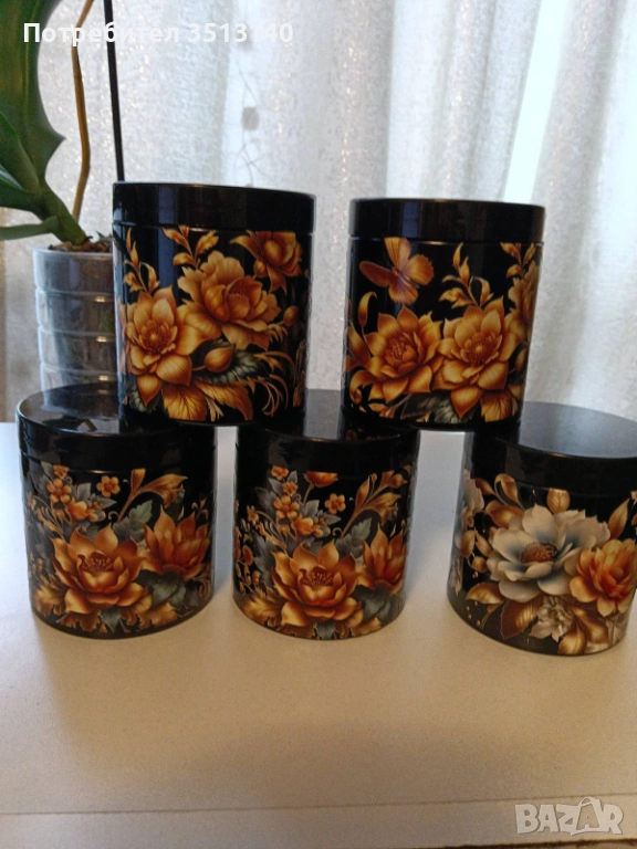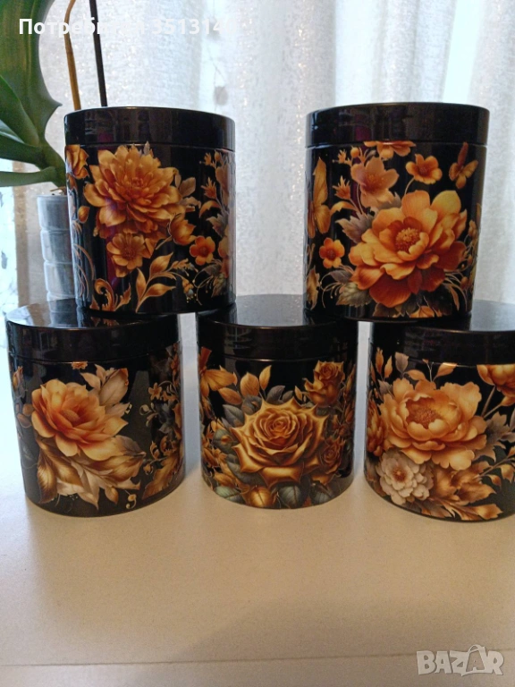 Комплект от 5 броя пластмасови кутии за съхранение или подправки с вместимост 500 мл с ръчно нанесен декор. Могат да се мият, но не в съдомиялна.