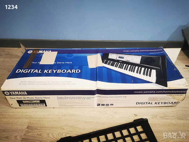 Окомплектован е със захранващ адаптор, поставка за ноти и кутия.
