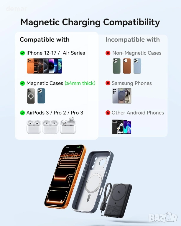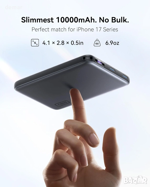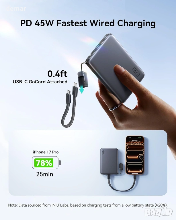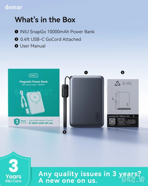 Ултратънка 0,5-инчова магнитна външна батерия с капацитет 10 000 mAh, проектирана за преносимост без допълнителен обем, с Qi2-сертифицирано 25W безжично зареждане за значително по-бързо презареждане в сравнение със стандартните магнитни зарядни устройства, заедно с високоскоростно 45W USB-C кабелно зареждане чрез вграден подвижен кабел за бързо и удобно захранване в движение; съвместима с по-нови модели iPhone за оптимална бърза безжична производителност и снабдена с вграден къс USB-C кабел и ръководство за потребителя.