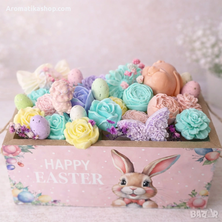 Великденската кутия, украсена с усмихнато зайче, пази в себе си богата композиция от ръчно изработени глицеринови цветя, ароматни яйца, мини фигурки, пеперуди и сухи цветчета — всичко подредено в хармония от меки цветове и много настроение.