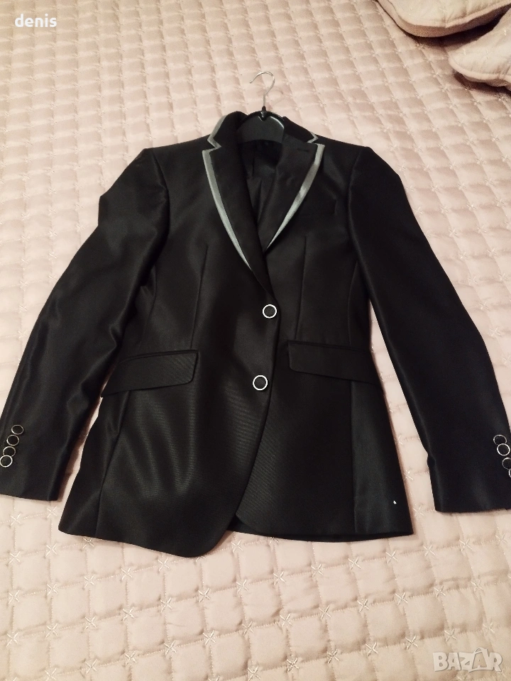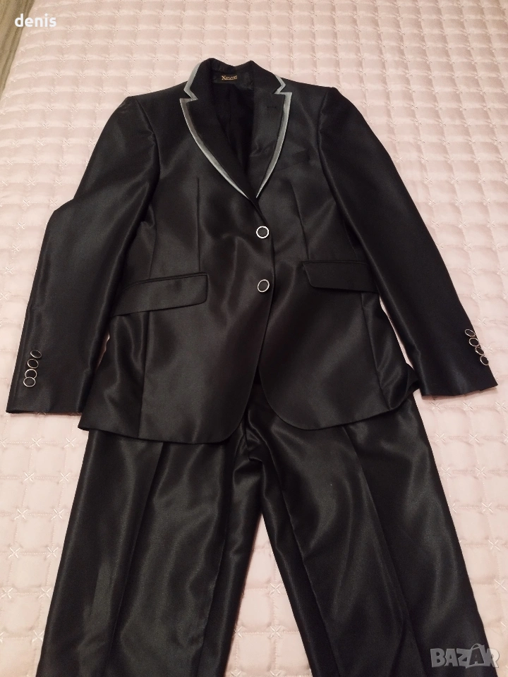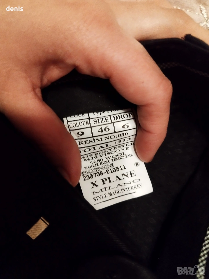 Елегантен мъжки костюм "X PLANE MILANO" – Стил и качество Продавам изключително стилен и модерен мъжки костюм от две части (сако и панталон) на марката X Plane Milano. Костюмът е с вталена кройка, модерен дизайн и е подходящ за официални събития, балове или сватби. Основни характеристики: Цвят: Наситено черен със сатенен блясък, който придава луксозно излъчване. Дизайн: Сакото разполага с елегантен контрастен кант на ревера в светлосиво/сребристо, което го отличава от стандартните модели. Материя (Високо качество): * 80% Вълна (Wool) – осигурява комфорт и терморегулация. 10% Вискоза и 10% Полиестер – за здравина и по-трудно мачкане. Произход: Произведен в Турция (известна с качественото си шивачество на костюми). Размери по етикет: Размер (Size): 46 Кройка: Slim Fit (втален модел) Състояние: Костюмът е в отлично състояние, без следи от употреба. Поддържан е изключително чрез химическо чистене Възможност за преглед и тест преди плащане. За повече информация или допълнителни мерки, моля, пишете на лично съобщение.