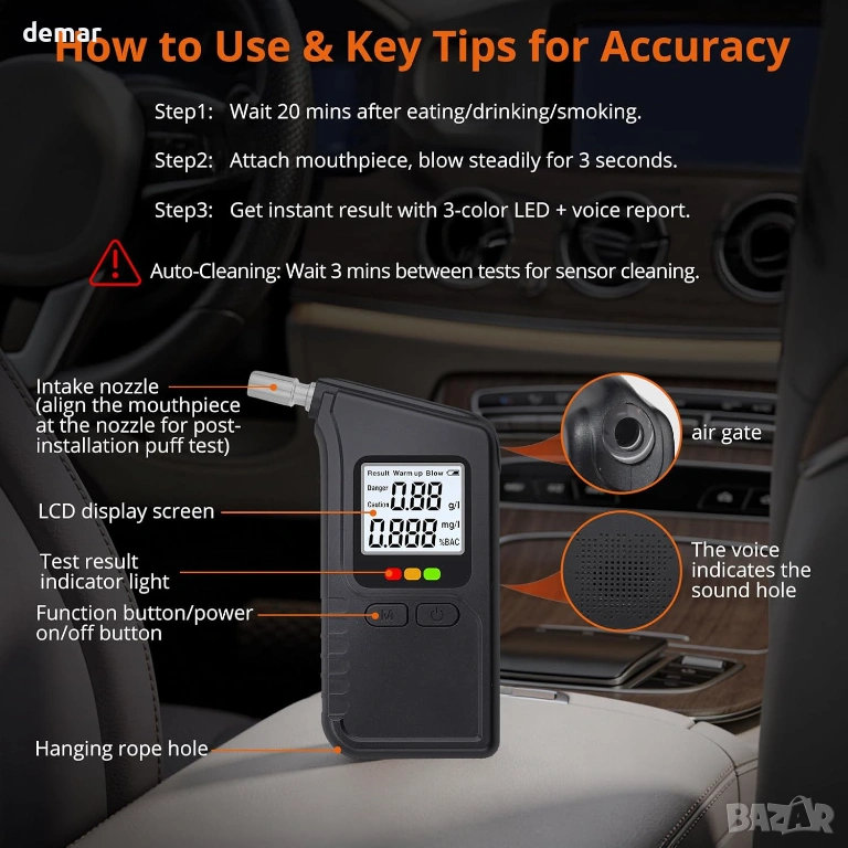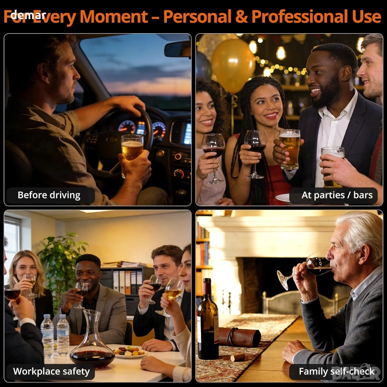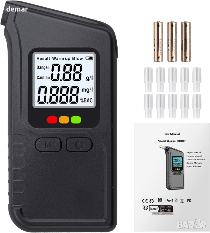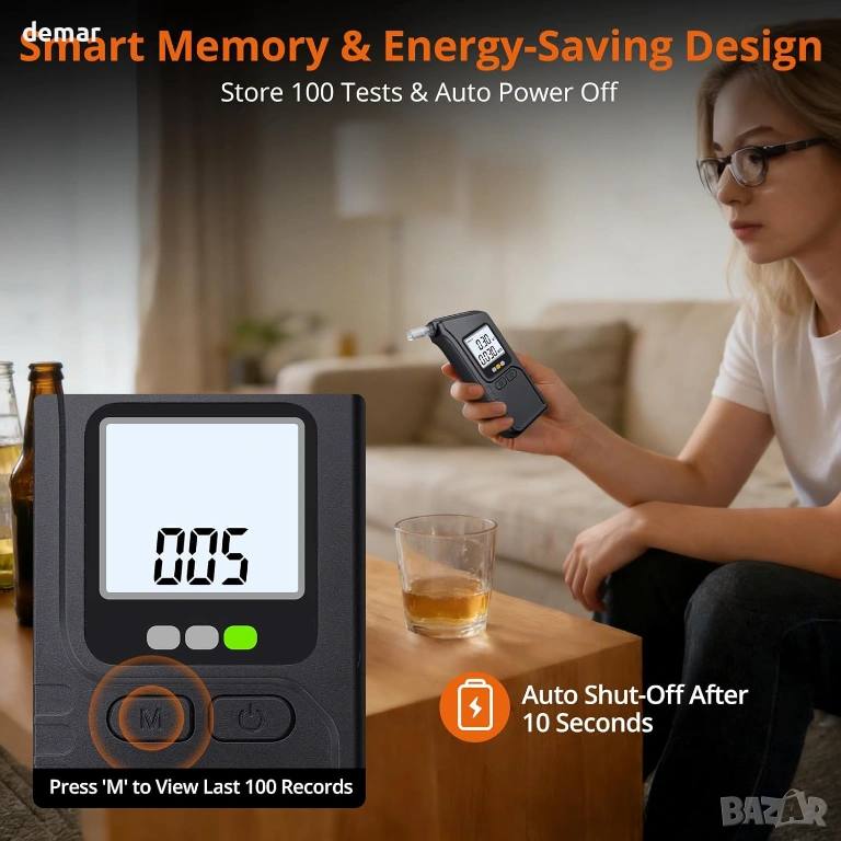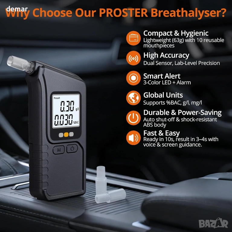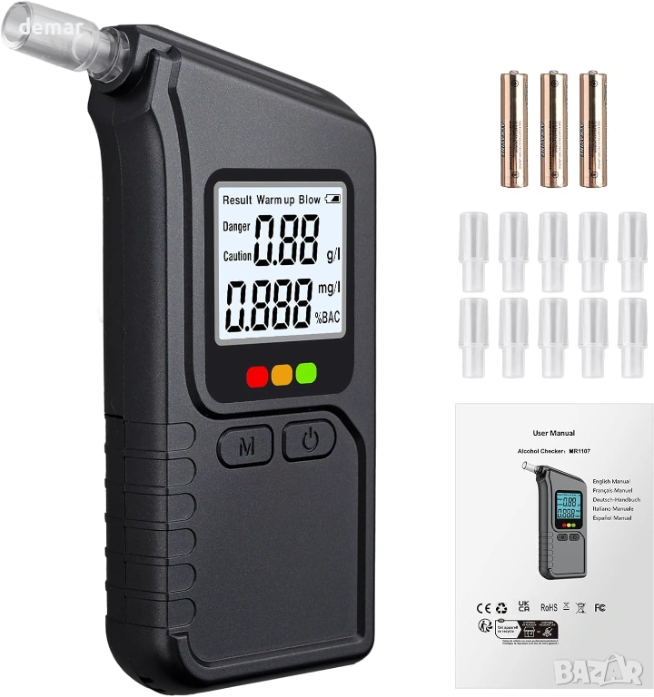 Този преносим дрегер използва технология с двоен сензор, за да предоставя високоточни показания за концентрация на алкохол в кръвта, подобни на професионалните устройства, като резултатите са налични за секунди след кратко загряване. Той разполага с ясен трицветен светодиод и звукова система за бързо показване на нивата на безопасност, както и с памет за до 100 предишни теста, за да се следи употребата във времето. Проектиран за удобство, компактната и лека конструкция с издръжлив корпус го прави лесен за носене навсякъде, а функцията за автоматично изключване спомага за запазване на живота на батерията. Доставя се с множество мундщуци за многократна употреба за хигиенична споделена употреба, той е подходящ за лична, семейна или работна безопасност и е готов за употреба с включени батерии за надеждно тестване в движение.