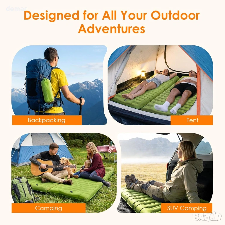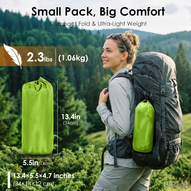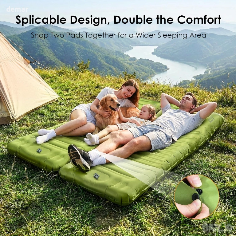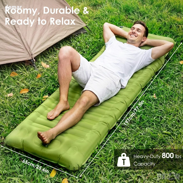Изключително широк и дебел къмпинг матрак (197×65×12,5 см), проектиран за повишен комфорт върху неравен терен, с вълнообразна структура на въздушните клетки и вградена възглавница за опора на тялото и намаляване на натиска върху гърба и врата. Предлага бързо напомпване без помпа за по-малко от минута и бързо изпускане чрез двуслоен клапан за лесно опаковане. Изработен от издръжлив, водоустойчив и тих 50D найлон с TPU покритие, той осигурява надеждна работа при различни условия на открито. Подложката включва странични бутони за свързване с друга единица за двойно място за спане, а лекият ѝ дизайн от 1 кг се сгъва компактно с чанта за съхранение, което го прави изключително преносим за къмпинг, пътуване и дейности на открито.