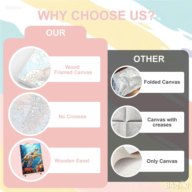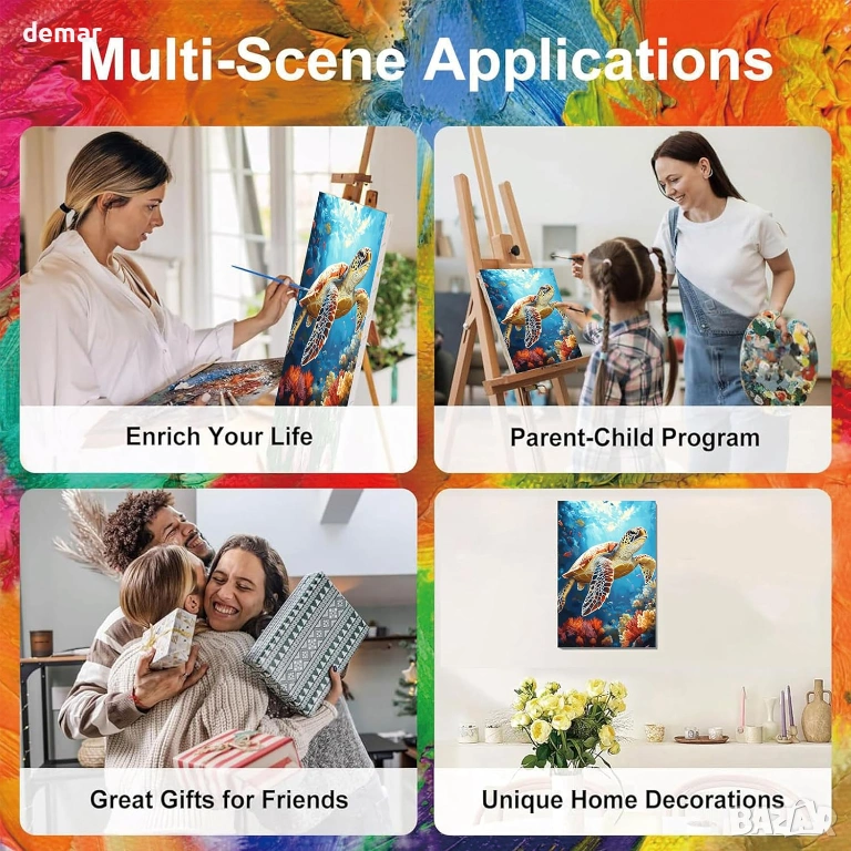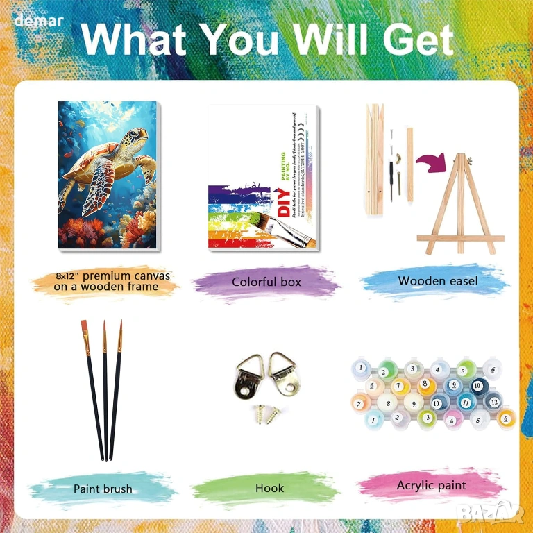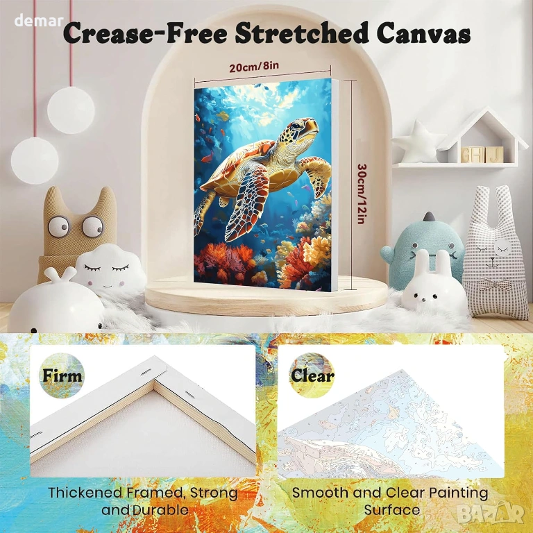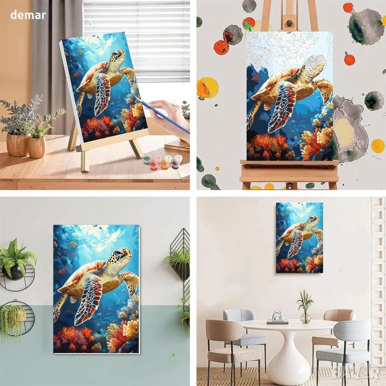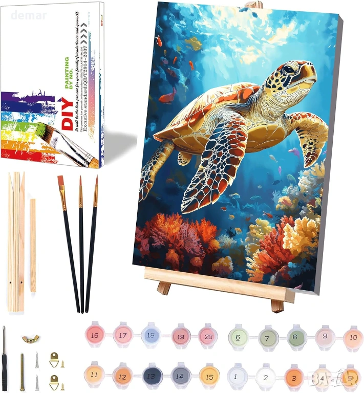 Боядисване по номера с костенурка за възрастни с рамкирано платно и дървен статив, 20х30 см