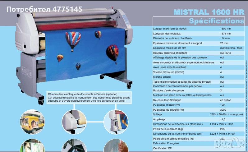Ширина на ламиниране до 1600мм, регулиране на натиска на валовете, скорост на движение на медията и температура на подгряване до 160°С.