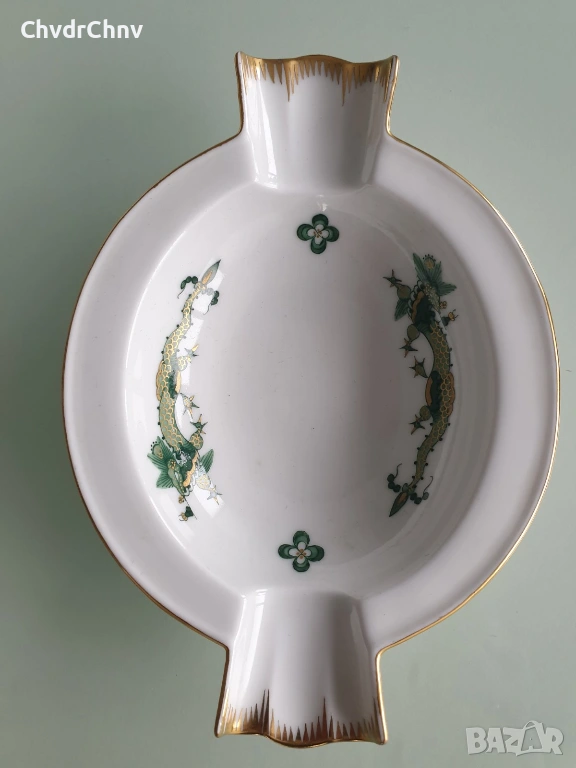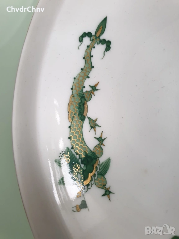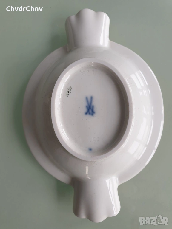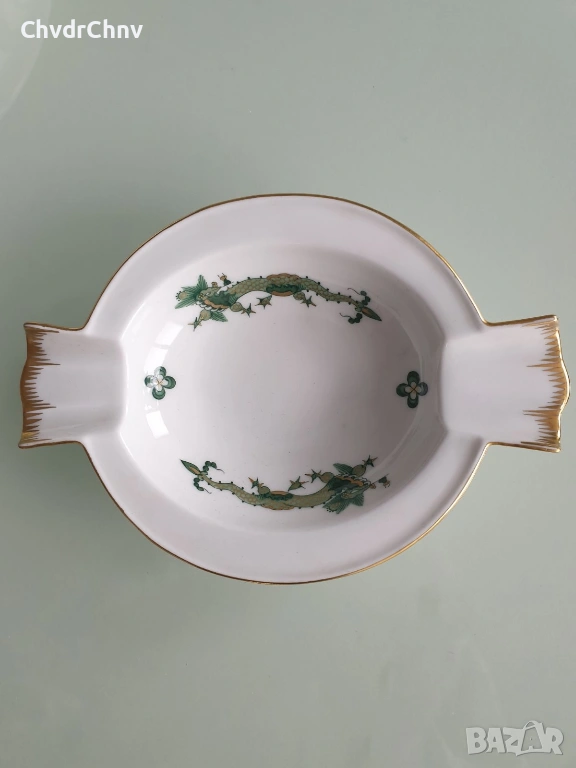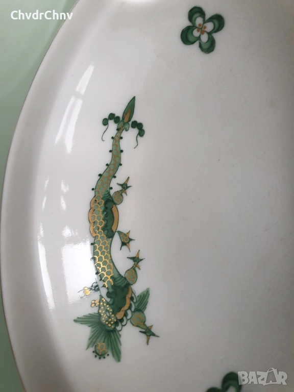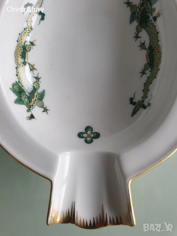 Размери 14х10 см (дебелина 3 см), ръчно рисуване, декорация с 22 карата злато по ръбовете, маркировка/печат отдолу на Meissen (кръстосани саби, сериен номер), в перфектно състояние (без забележки).