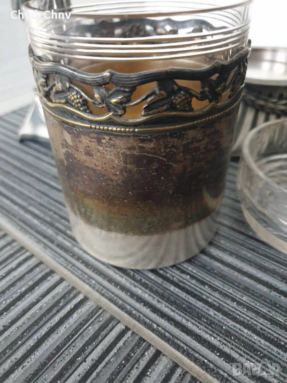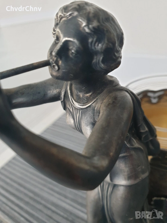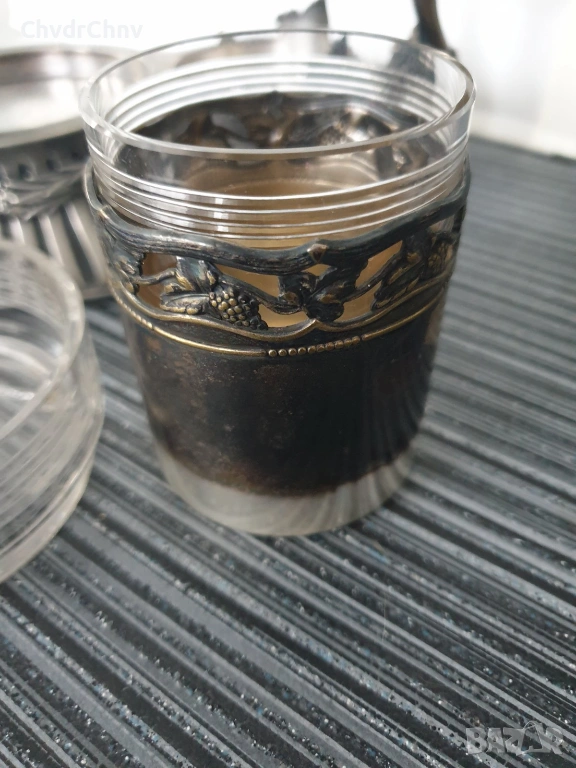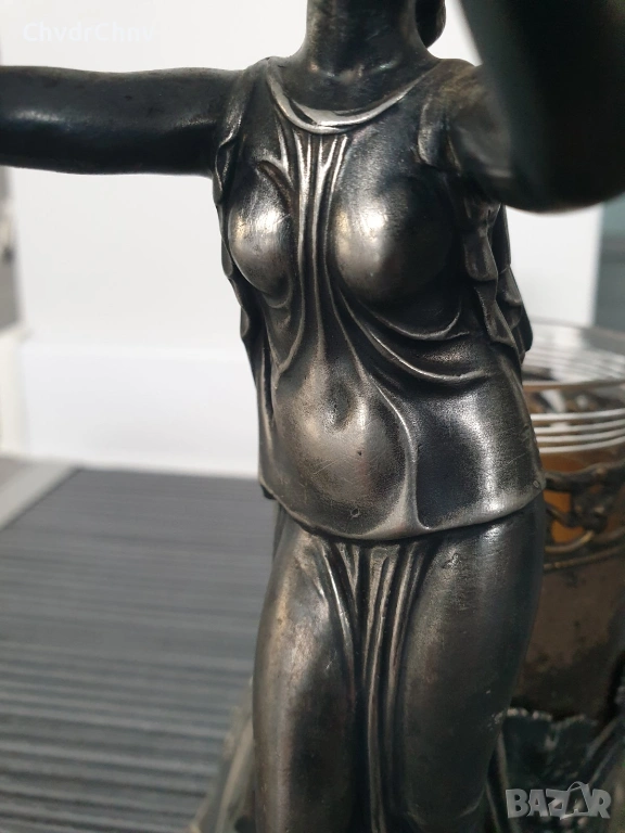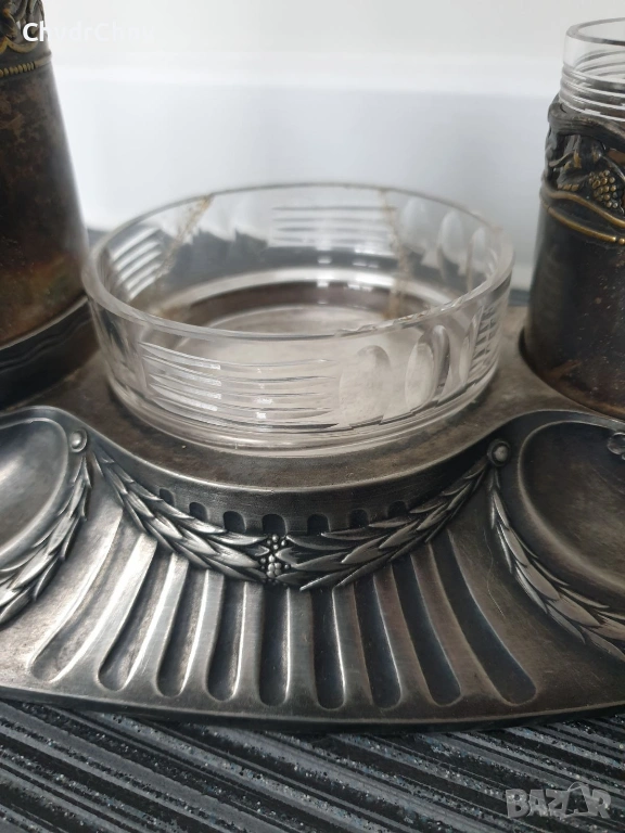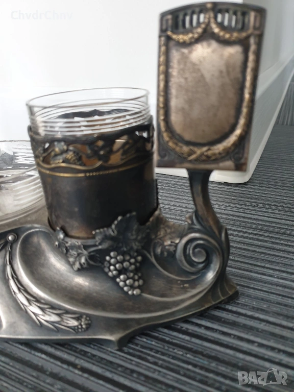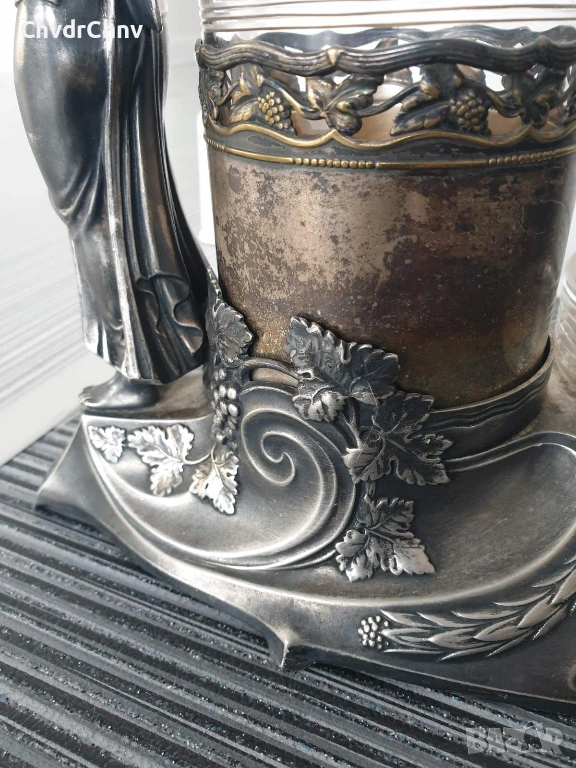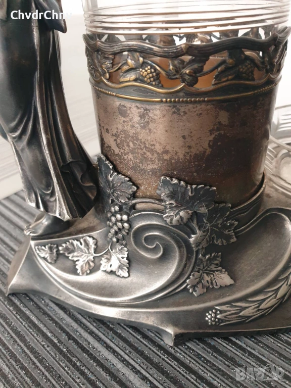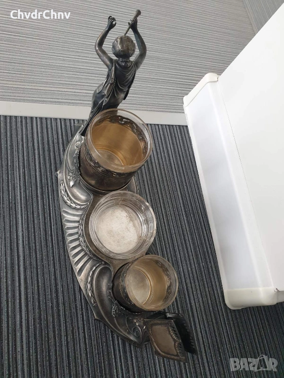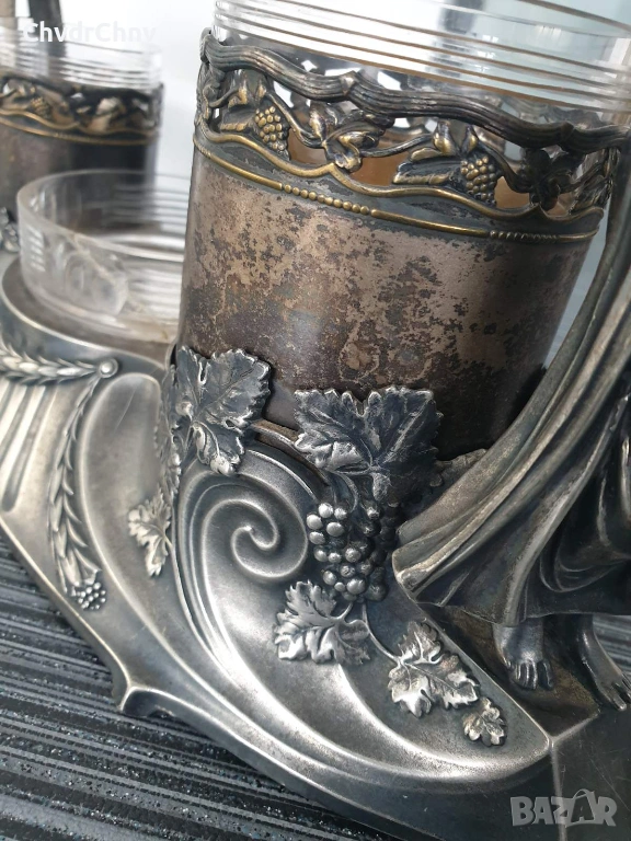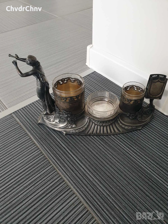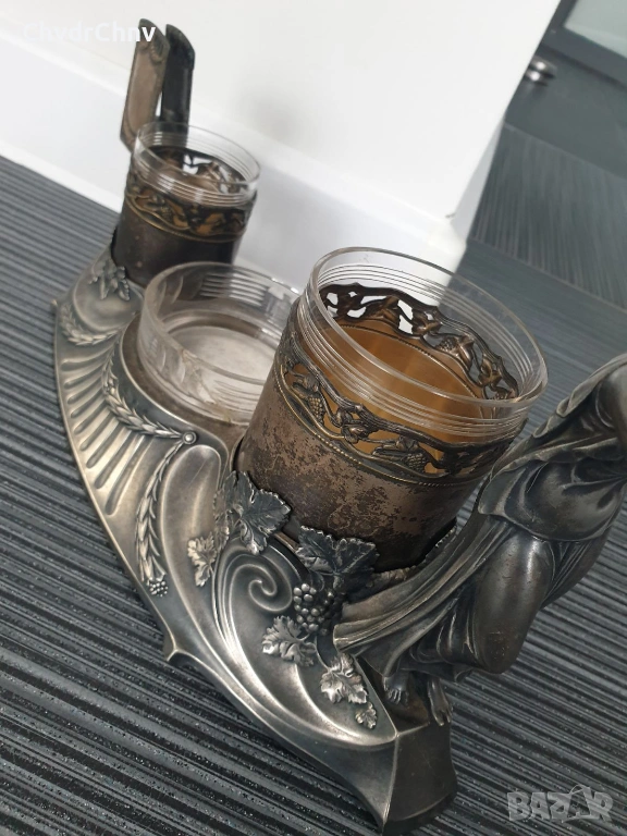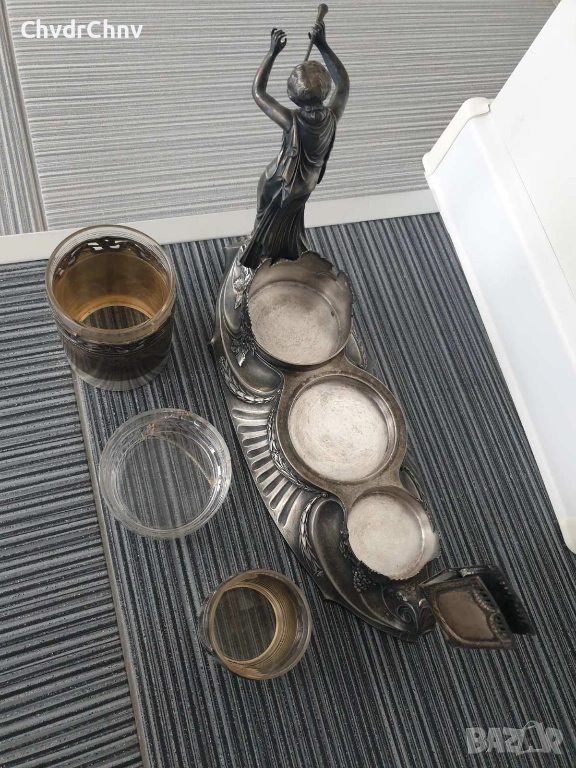 Височина 20 см, дължина 38 см, ширина 14 см, тежи около 2-3 кг, посребрен метал (стомана), изключително детайлни орнаменти, съдържа две чаши (оригиналните), държач за кибрит и пепелник (оригиналният, но стъклото е пукнато/залепено). Липсва едната от флейтите на женската фигура.