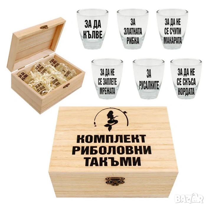 Дървен комплект „Риболовни такъми“ с 6 шота – оригинален и забавен подарък за любителите на риболова.