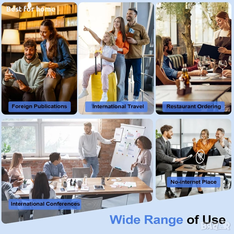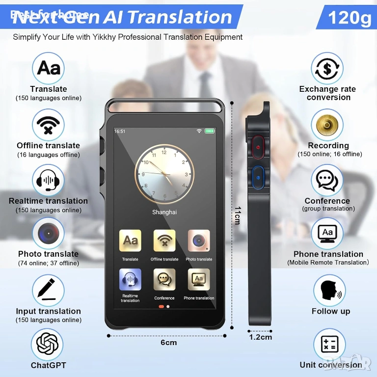 Многофункционални функции за всички ситуации: Това устройство за превод предлага повече от просто език: групов превод, въвеждане на текст, интелигентно записване, ChatGPT, както и преобразуване на световно време и валута. Това прави езиковия преводач без интернет перфектния спътник за международни бизнес срещи, пътувания по света, четене на книги на чужди езици или ефективно изучаване на езици.