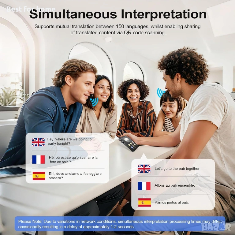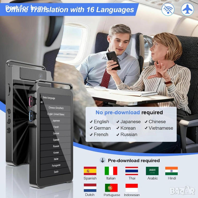 Пълна езикова поддръжка Нашето устройство за гласов преводач превежда онлайн 150 езика в почти 200 държави, включително диалекти. Преводачът с изкуствен интелект позволява функции за симултанен превод за плавни разговори. Освен това, гласовият преводач поддържа 17 езика офлайн без интернет устройство, идеално за използване при пътувания извън мрежата или в международни градове, за да се спестят скъпи такси за роуминг!