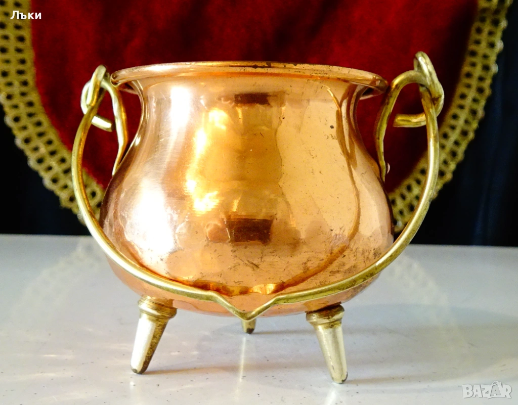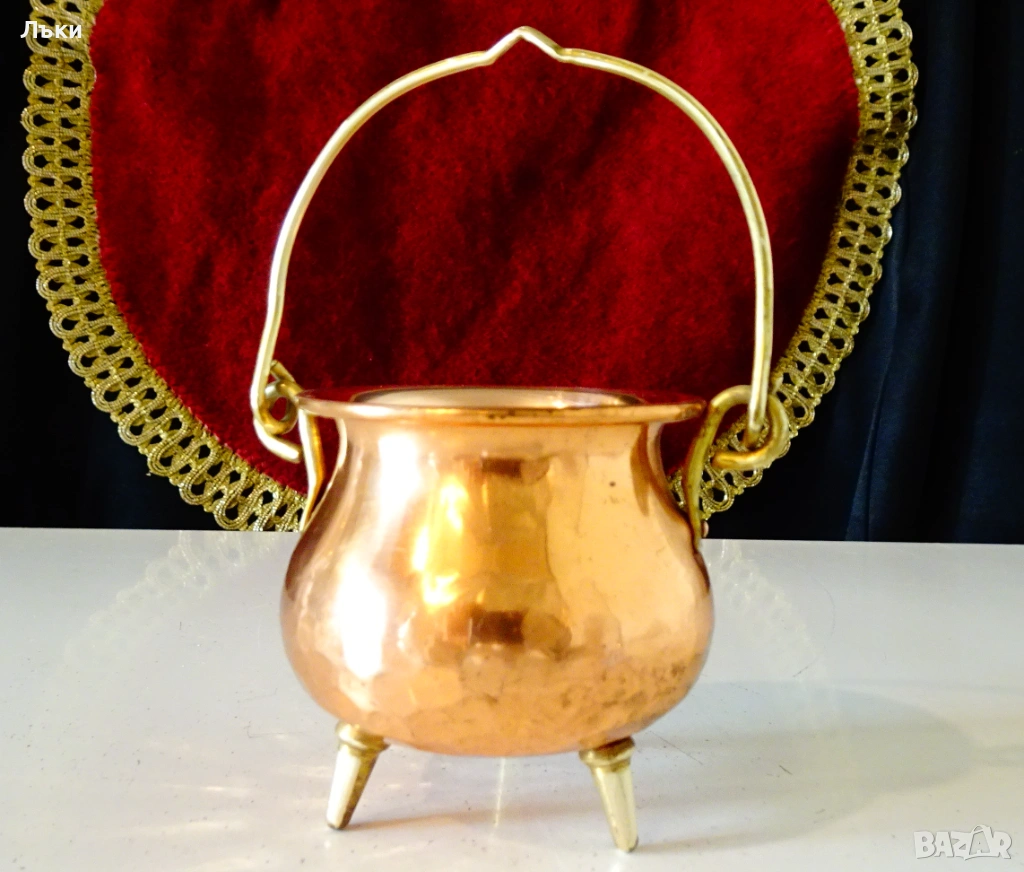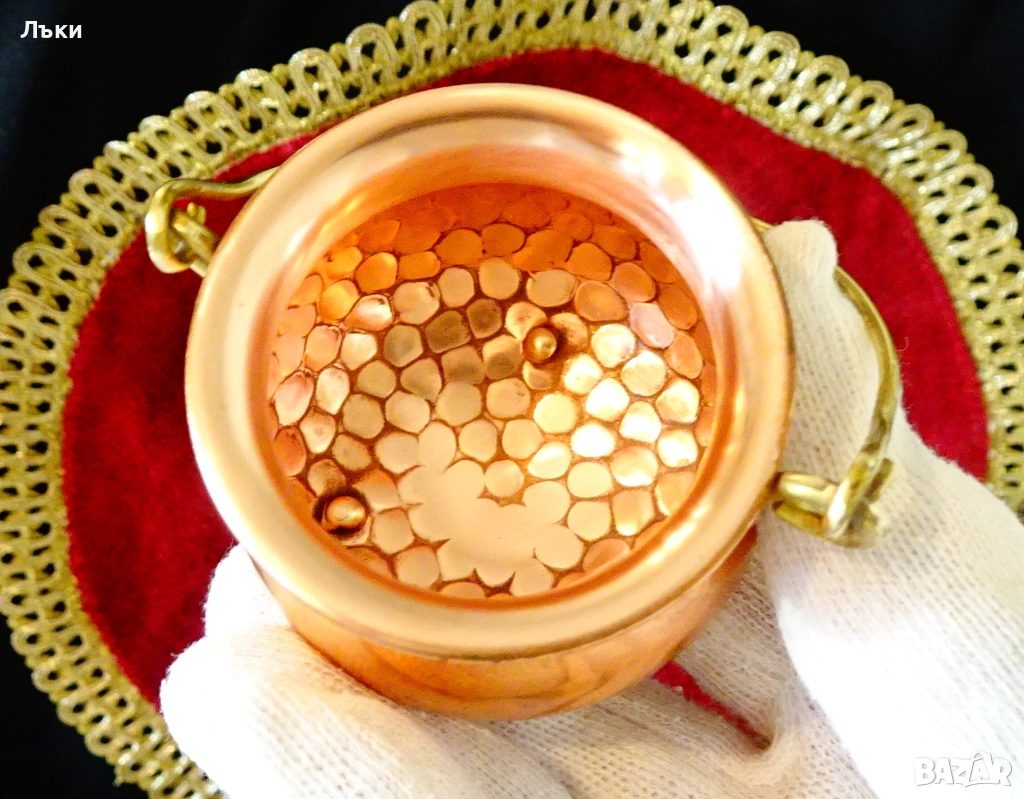 бронзови крачета.Има извита бронзова дръжка.Височина с дръжката 11 см.,височина