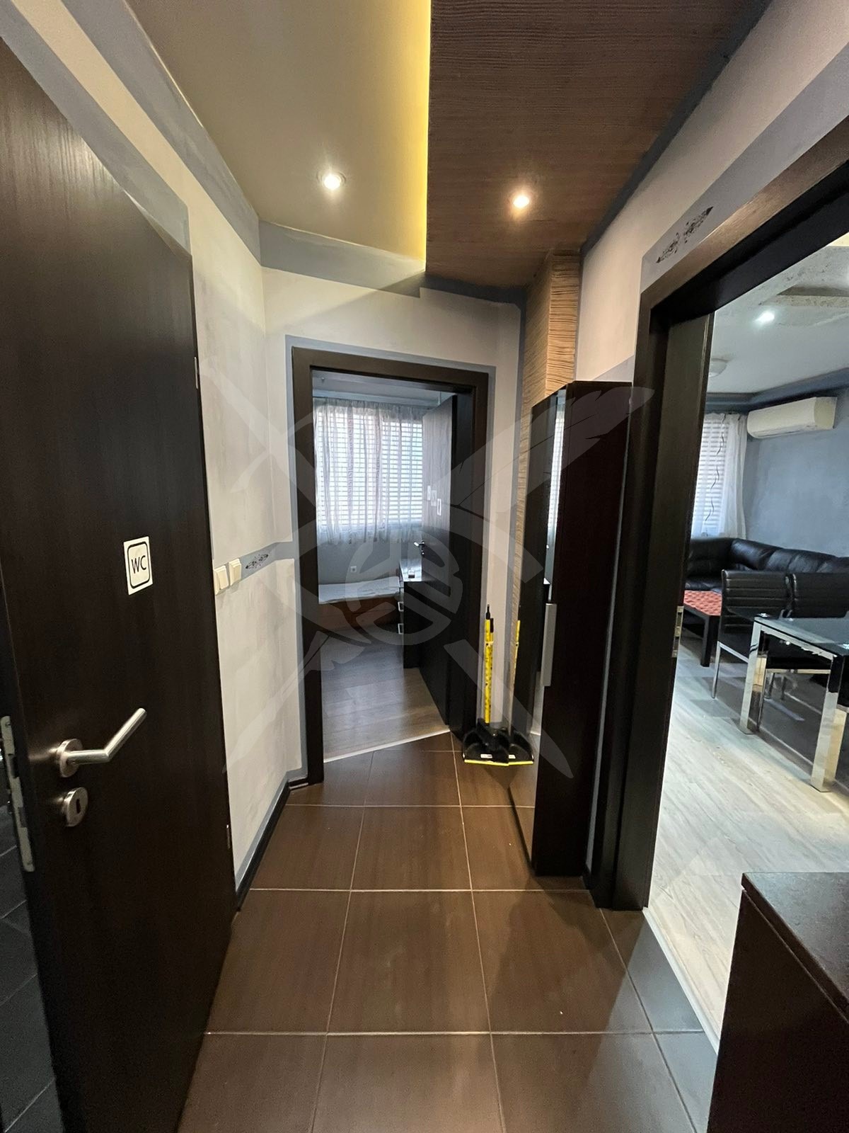 РАЗПРЕДЕЛЕНИЕ: Предлагаме за наем двустаен апартамент с обща площ 60 кв.м. функционално разпределени в спалня, хол с кухненски бокс, баня с тоалетна и тераса.